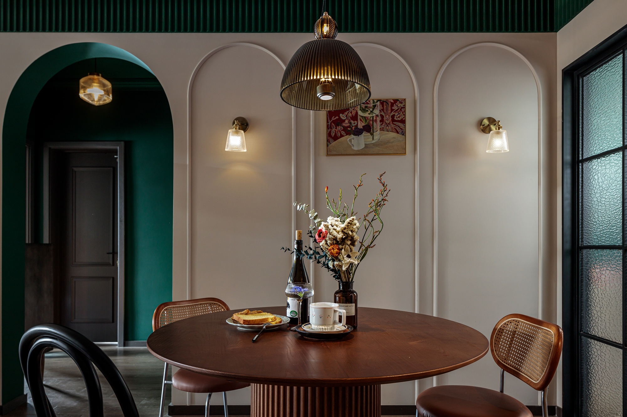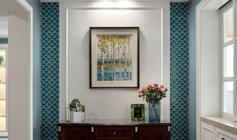 空間中的一大亮點(diǎn)是以拱形門進(jìn)入的靜區(qū)形式,左側(cè)為衛(wèi)生間干區(qū),右側(cè)為走廊端景。暖色玻璃吊燈、壁燈為其打造氤氳的光影效果,增添空間私密感。而視覺聚焦后,內(nèi)與外形成色彩對比,將動靜進(jìn)行區(qū)分,在設(shè)計(jì)與呈現(xiàn)上更注重了隱私性與靈活性。