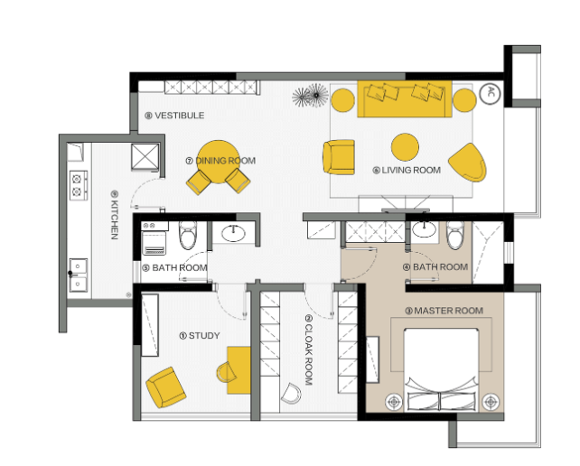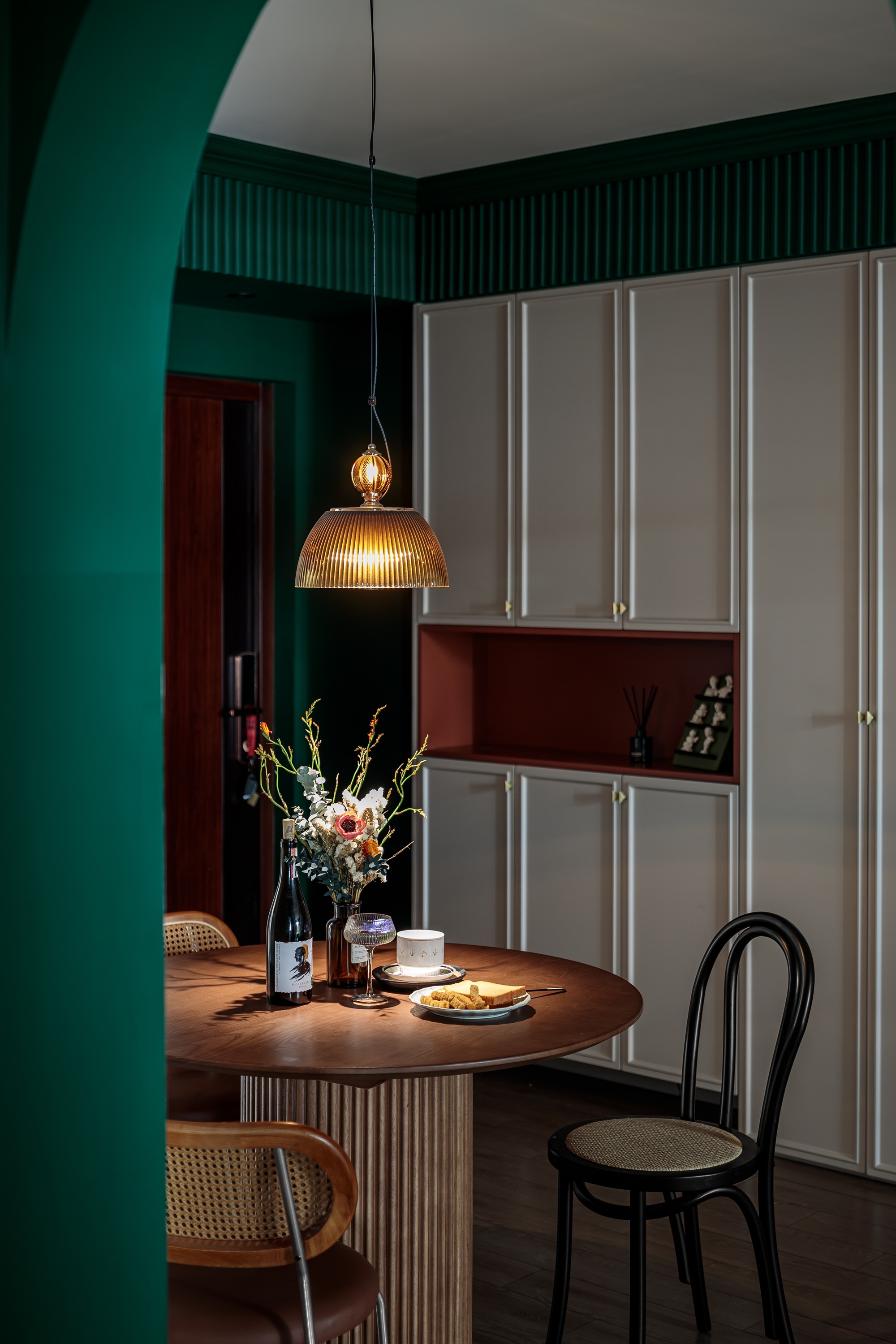 餐廳部分的光線會稍顯有點(diǎn)暗淡,廚房的玻璃門可以幫助餐廳引入部分光線,不用工作時(shí),一日三餐都在此處。使用圓桌,更有聚攏和圍合感,朋友聚會時(shí)會更有聊天氣氛。