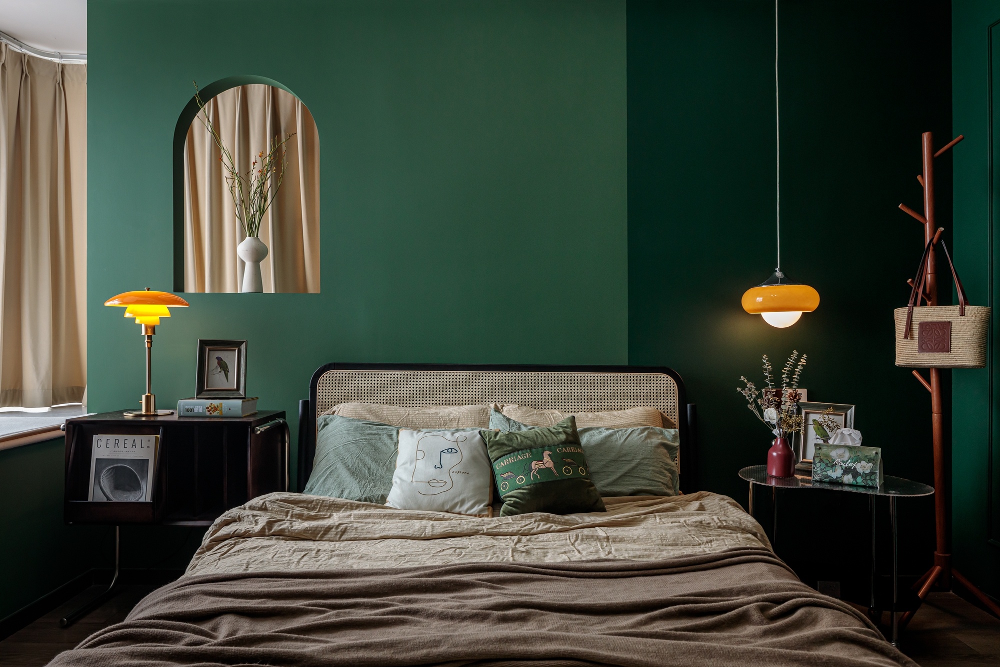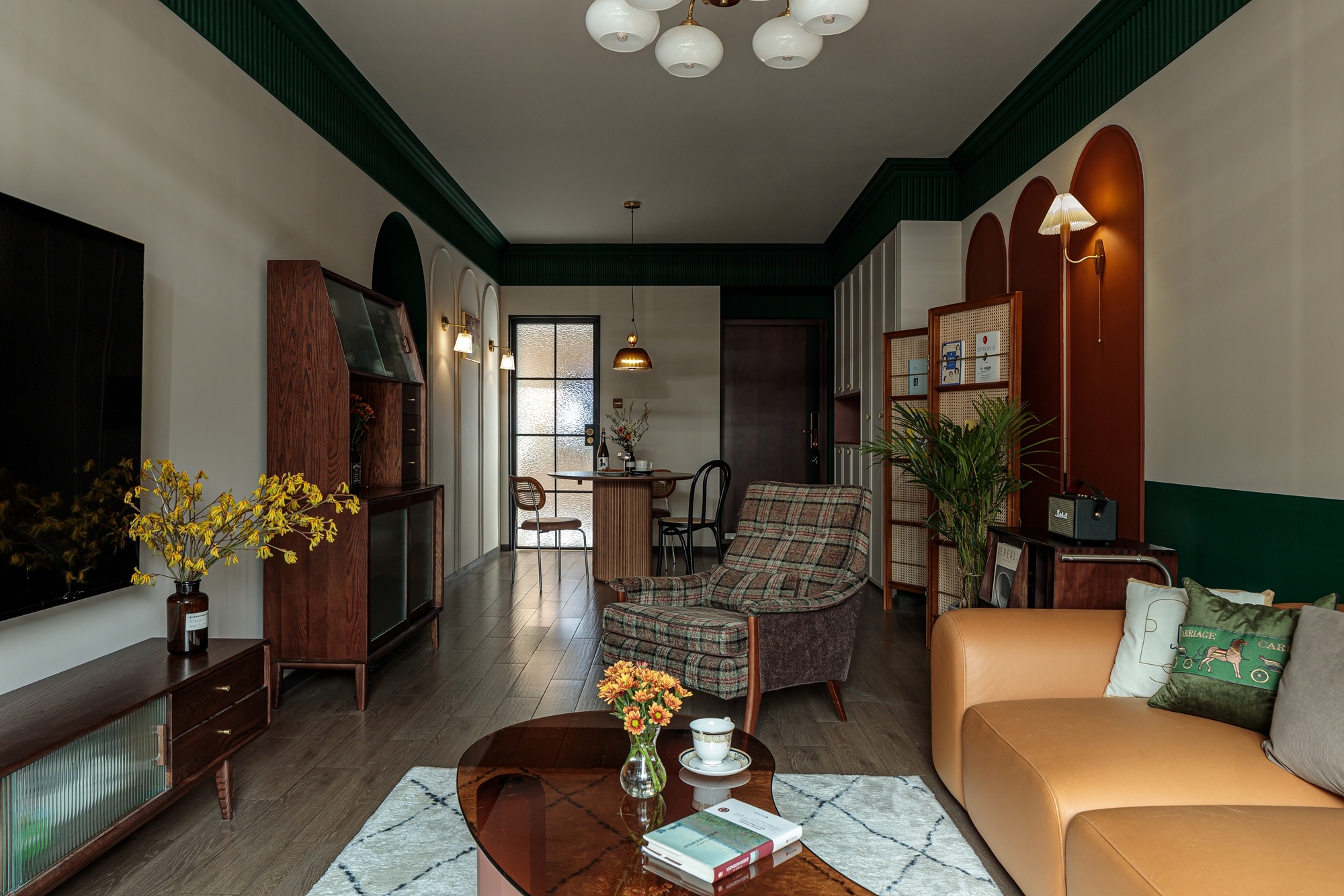 以色塊為墻體造型,壁燈、復(fù)古掛畫、都是屋主喜愛的配飾成品,將這些集合為空間的故事素材,進(jìn)一步豐富墻面的質(zhì)感。在紅綠之間融入淡金色沙發(fā),本身自帶的精致復(fù)古氣息,流連的金屬味道香醇而低調(diào),散發(fā)出舒適的溫暖氣氛。