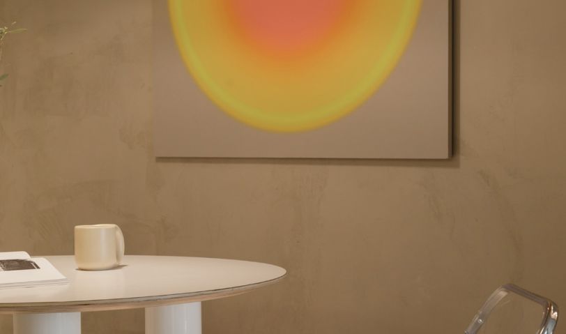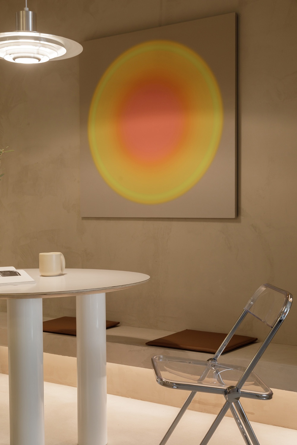 餐廳墻面掛了一副日落光暈風格的裝飾畫,抽象的光暈圖案很有裝飾感,在靠墻下方做了一排卡座,師傅現(xiàn)場用鋼架制作,保證承重,表面固定木工板后刷漆,保證風格和效果,下方布置燈帶讓空間的光源更有層次
