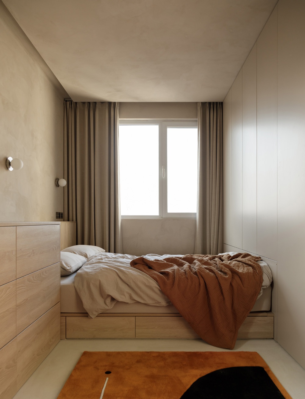 橘色的蓋毯和地毯也算空間里的亮色點綴,和客廳的配色相呼應