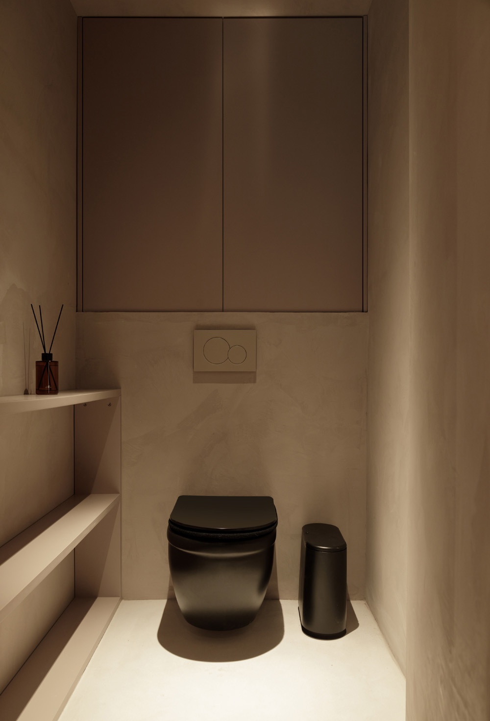 配色也和房子整體的配色呼應,暖色調的藝術漆墻面,黑色的馬桶和垃圾桶點綴顯得特別又高級