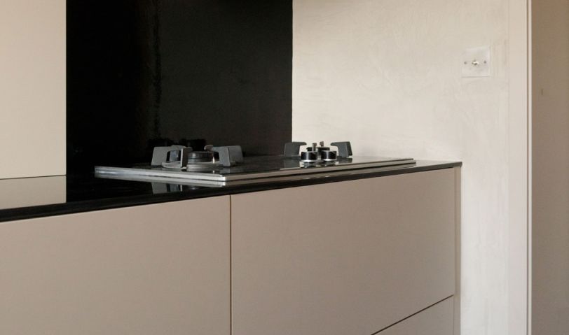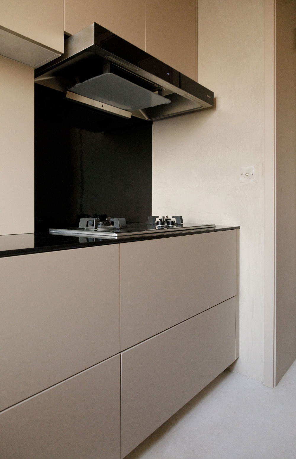 墻頂面用藝術漆延申進來,定制墻面同色的柜門板,搭配黑色的臺面和五金,金屬色的插座點綴