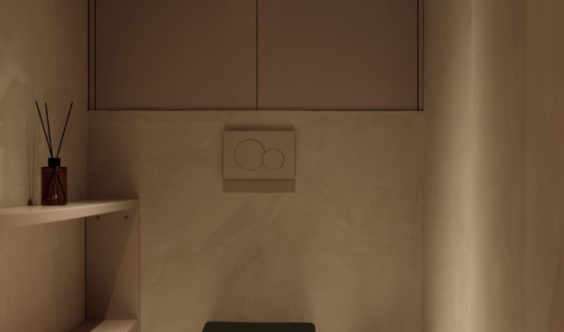 利用壁掛馬桶上方的空間做了儲物柜,側面的隔板可以用來放置一些香薰抽紙類的東西