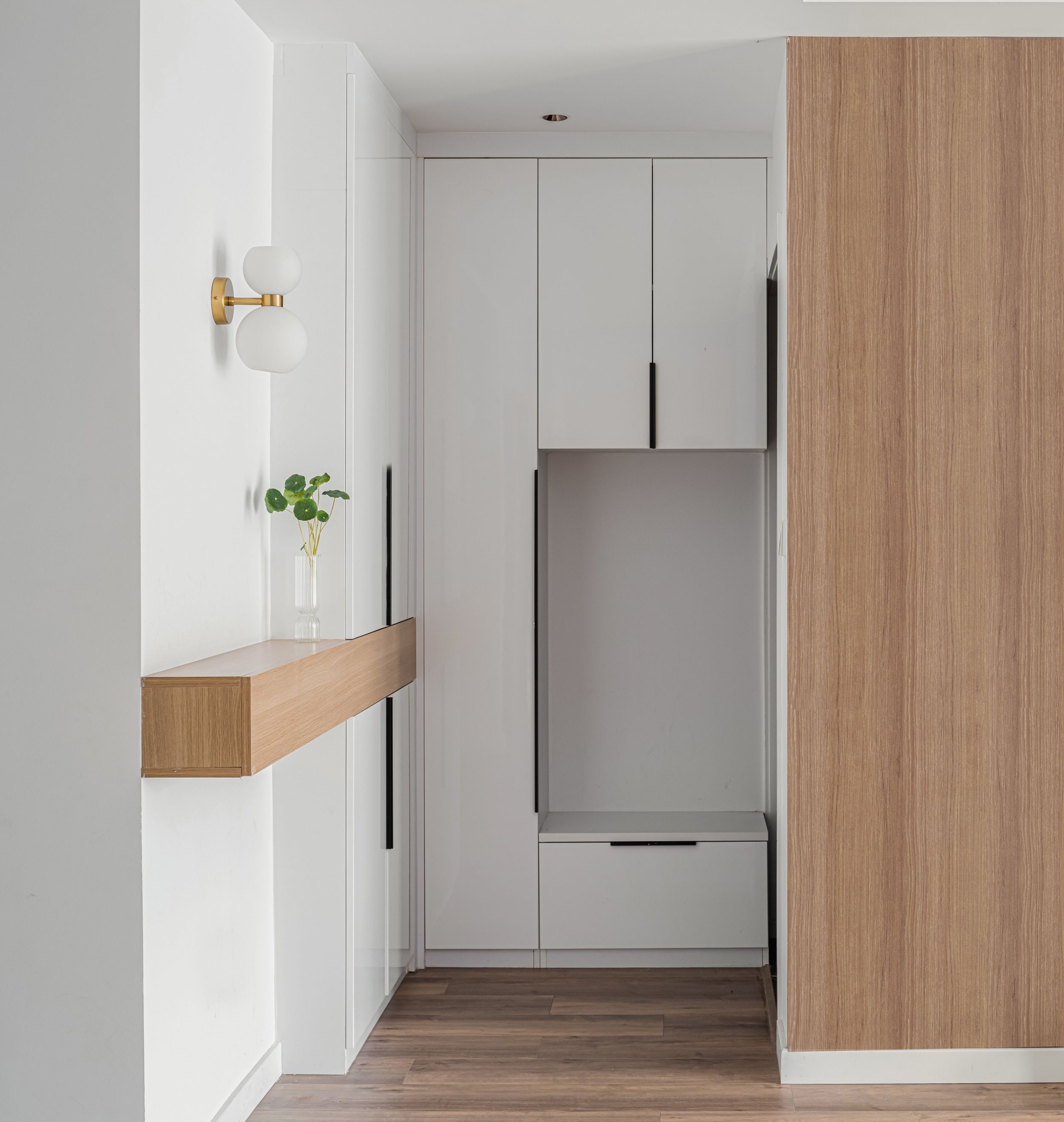 玄關(guān)白色的柜子設(shè)計,干凈又舒適。利用現(xiàn)場原有凹下去的墻體造型,將柜子嵌入進去,完美地增大了空間的使用效率。