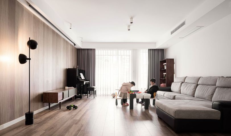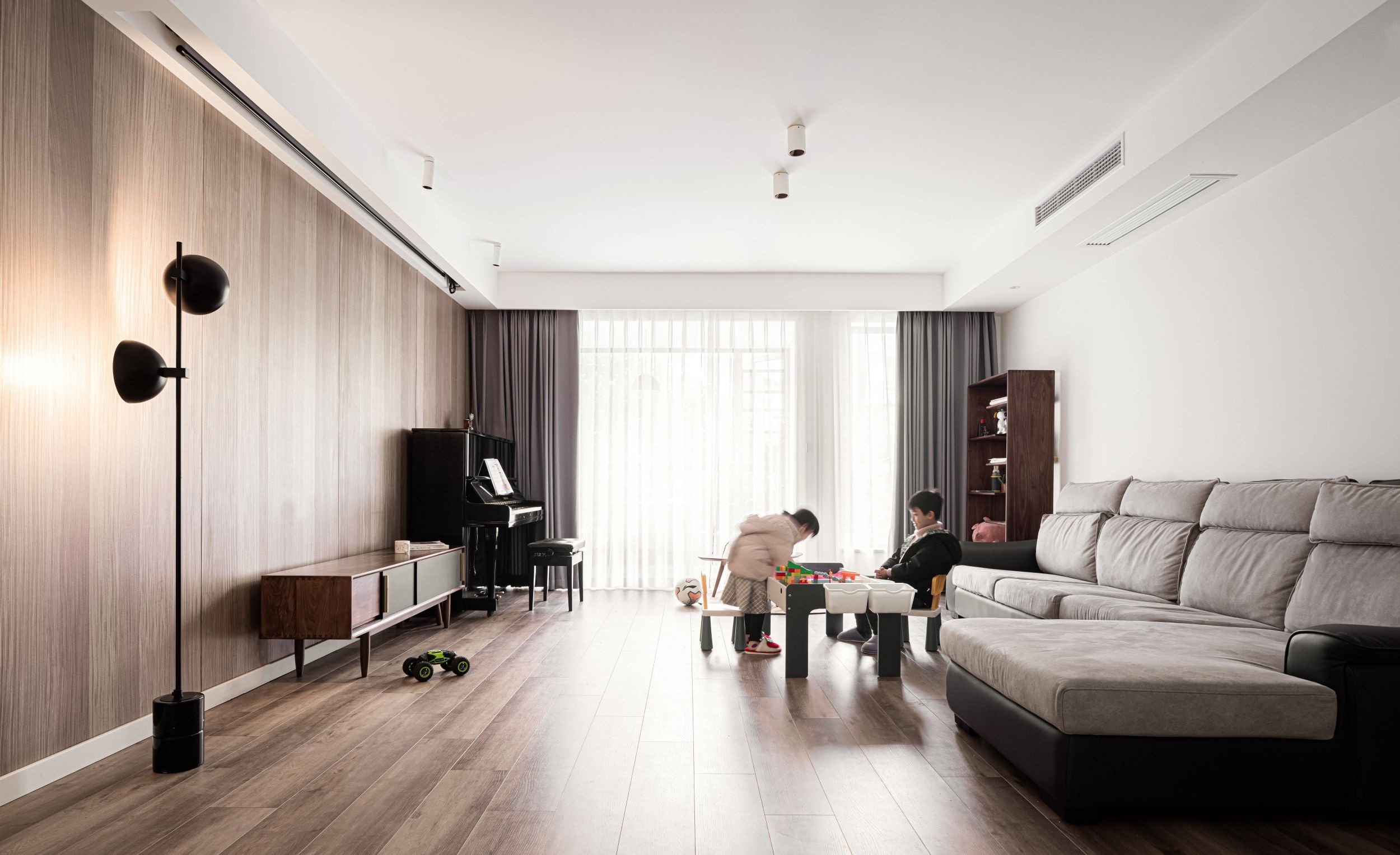 客廳應(yīng)屋主要求,更多的留給在成長的孩子使用。哥哥、妹妹一起彈鋼琴、玩積木,暖暖的居家感。