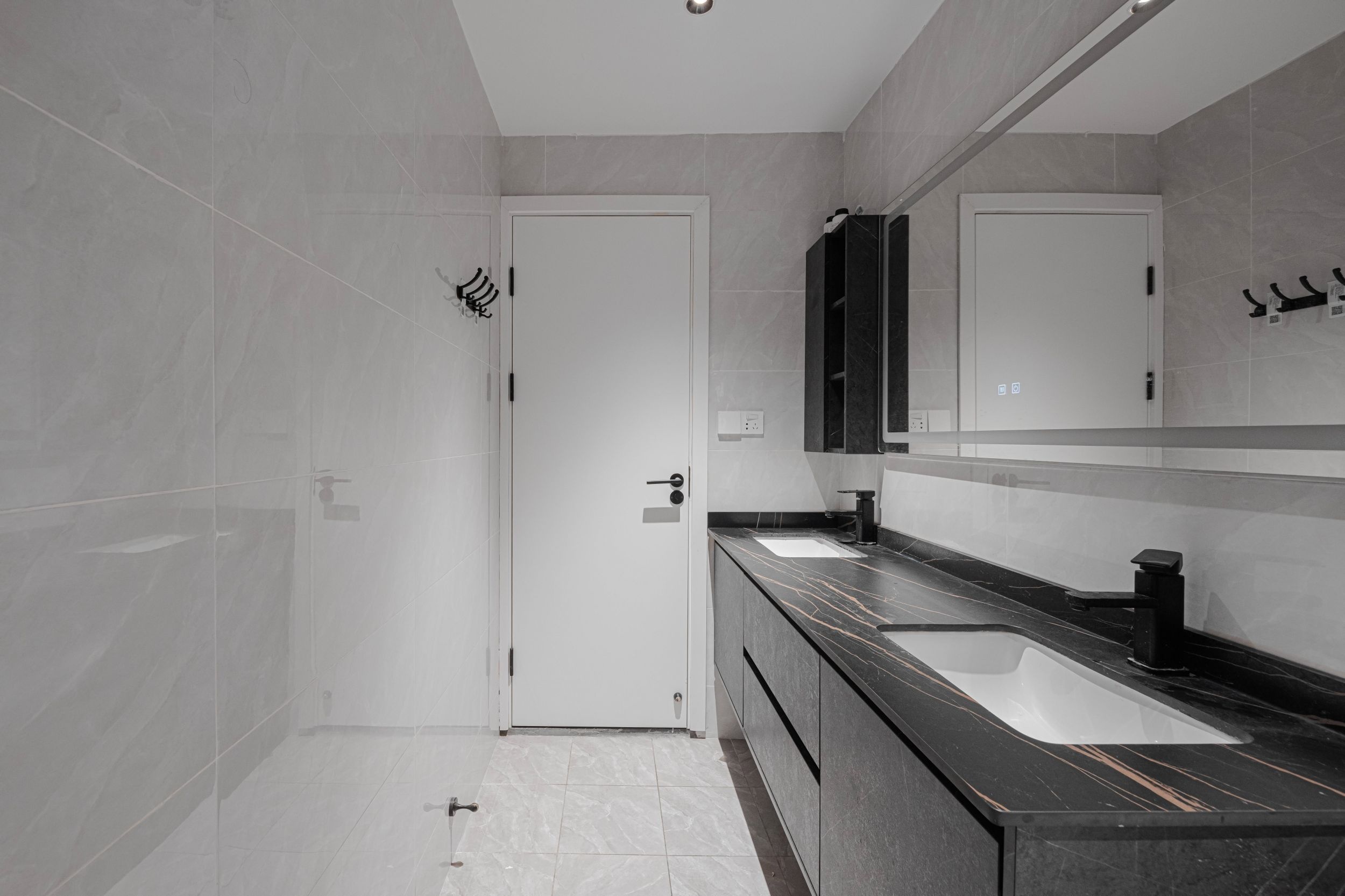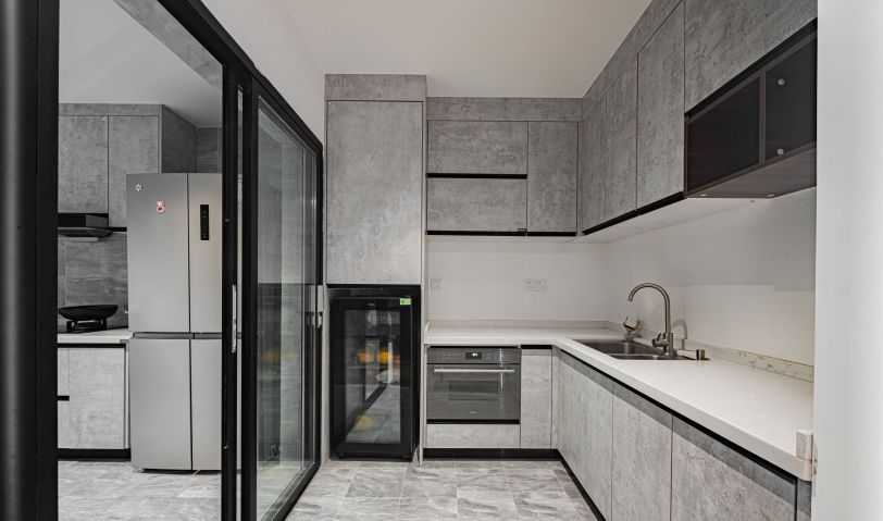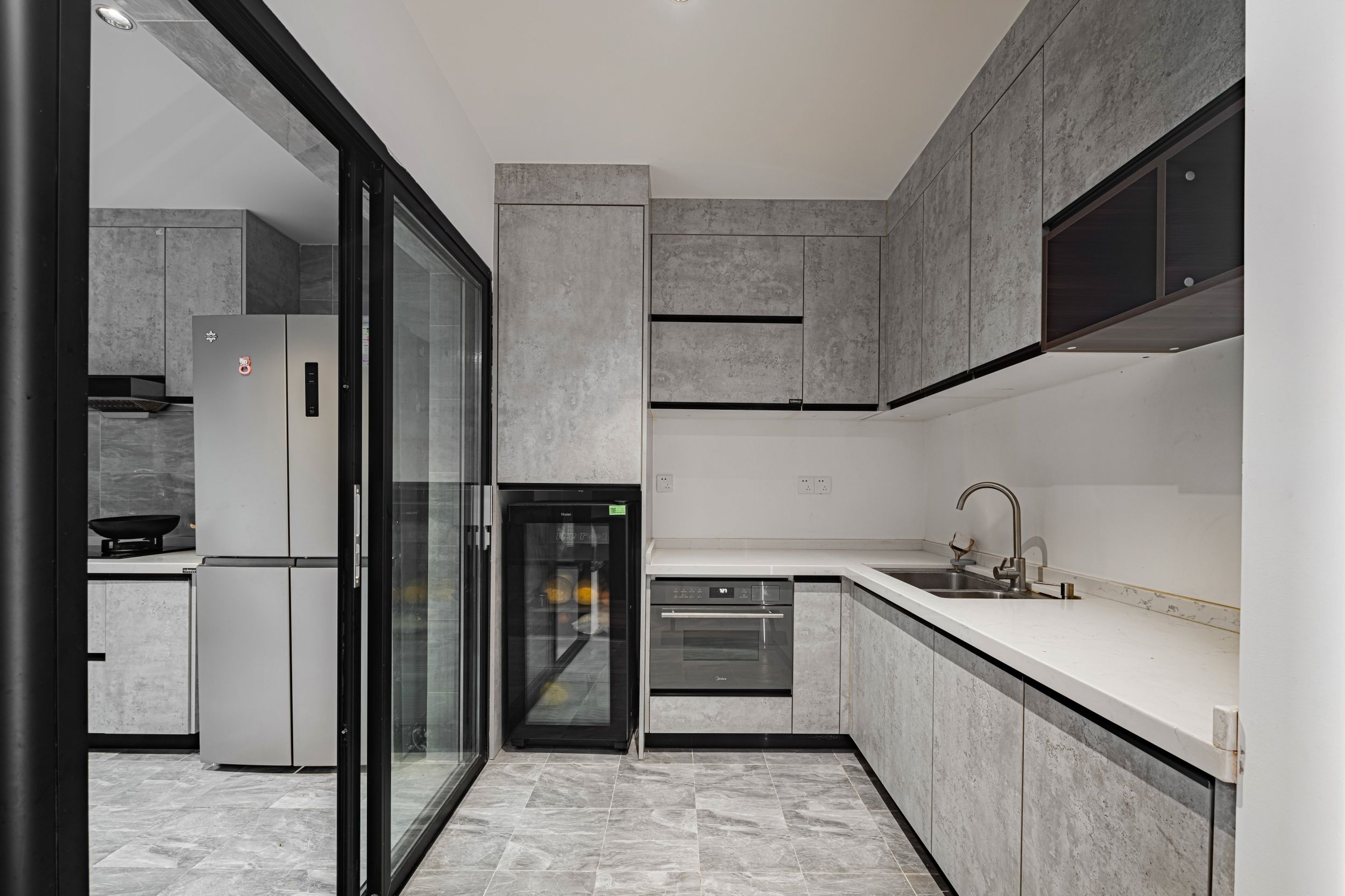 廚房采用了比較大膽的材,用了紋理跳躍的柜門,統(tǒng)一又協(xié)調(diào)。西廚設(shè)計了水盆及水果冰箱、烤箱等的功能,方便屋主后期生活的使用。