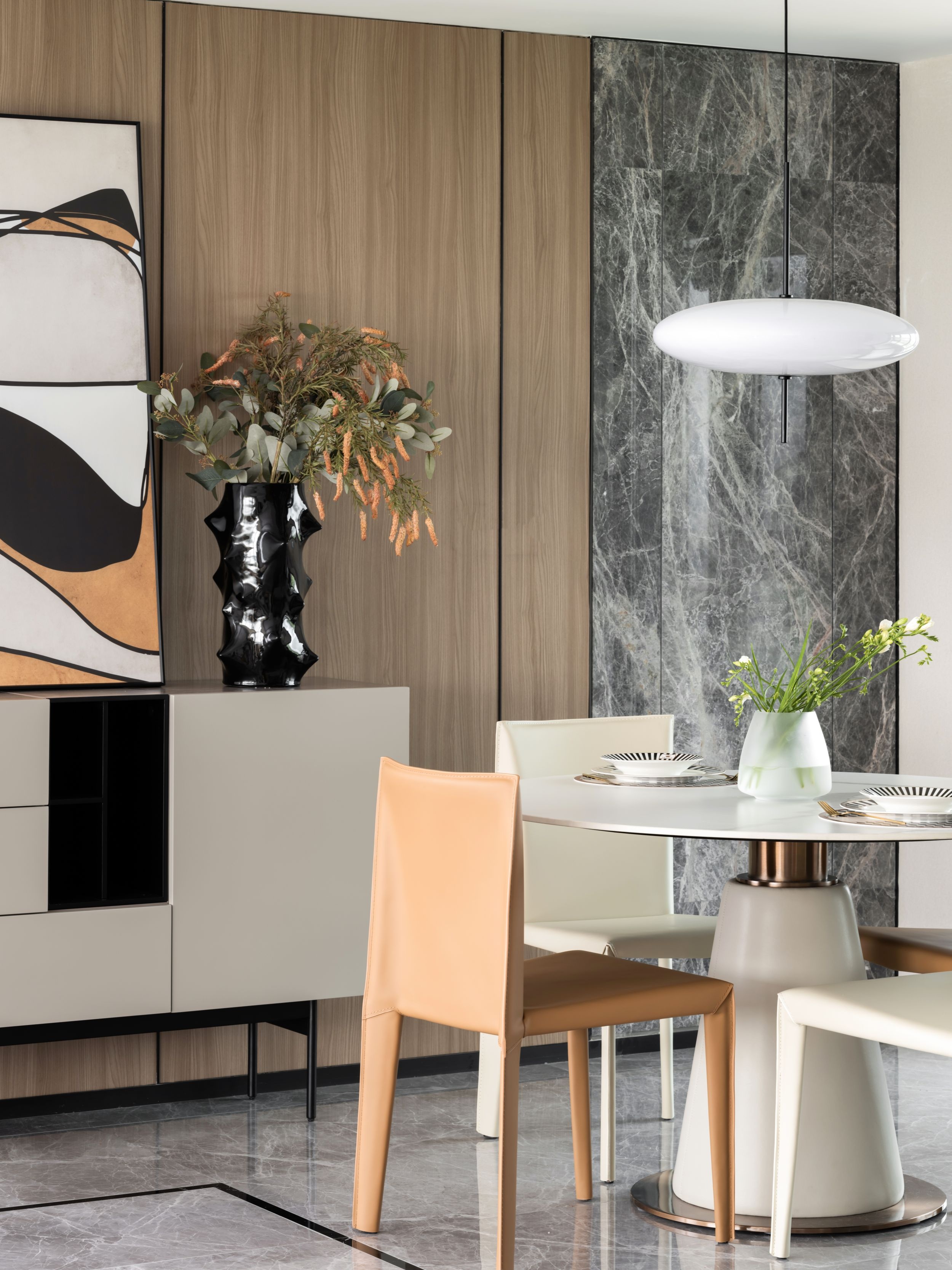 杏橙雙色餐椅與一旁的裝飾畫相互呼應(yīng),餐桌上的綠植就像是喚醒了空間的生機(jī)一般,營造出了十分協(xié)調(diào)的空間美感。