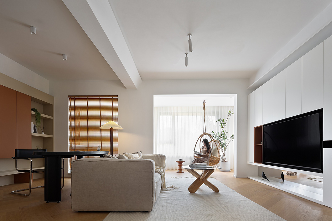 整面墻的柜體與玄關(guān)鞋柜形成L型串聯(lián),不僅保證了收納,而且空間聯(lián)動(dòng)自然,轉(zhuǎn)角處鏤空,結(jié)合鏤空處的鏡面處理,增加了空間的變幻與趣味性