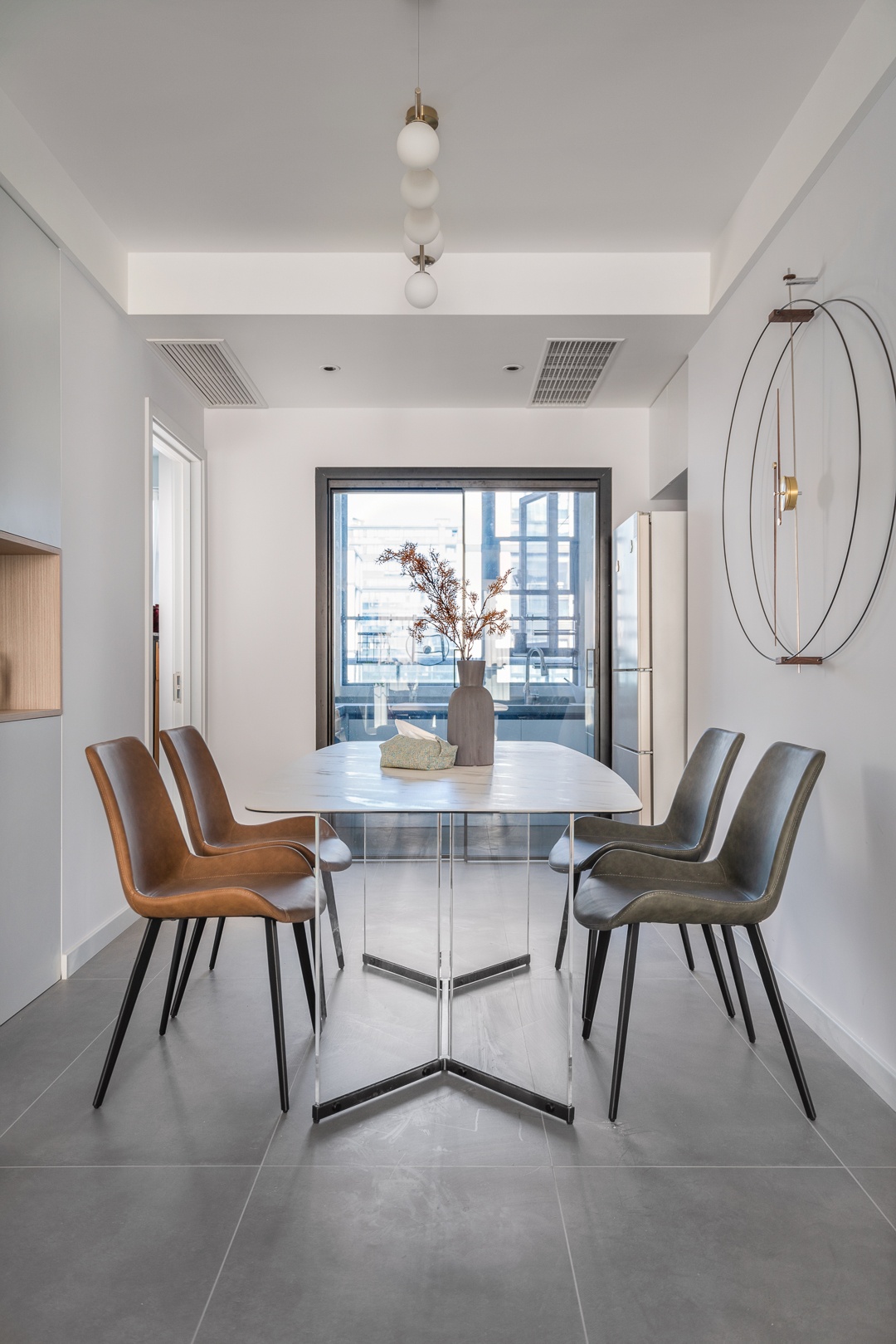 開放式的客餐廳布局讓公共區(qū)域被完全打開,廚房門優(yōu)化成通透的玻璃移門,光線自由穿透入室。至此,客餐廚三個空間形成了流動的滲透互動關(guān)系。
