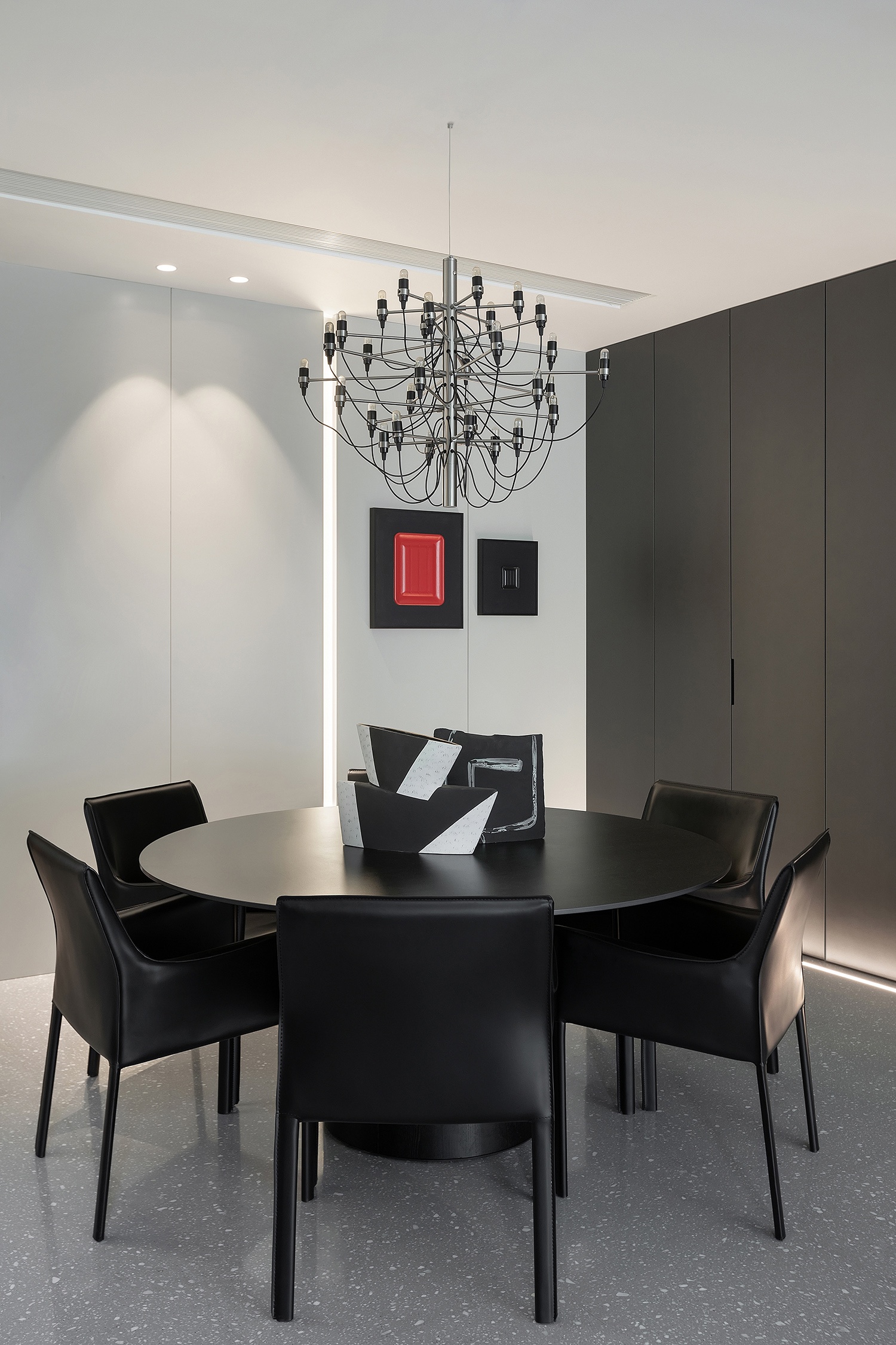 黑白,方圓之間,當世間萬物的兩個極端發(fā)生和諧的碰撞,空間的一致性反而得到了更完美的實現(xiàn),方正的空間感完美劃分了各自特色的區(qū)域,灰色落地的大玻璃移門可以自由分隔且鏈接廚房和餐廳的關系,非常綜合了喜好和生活習慣,嬌潤的圓桌則能給家庭添加幾分溫馨,其樂融融的氛圍。干凈簡潔的線條,利落大方地彰顯了業(yè)主的品味。