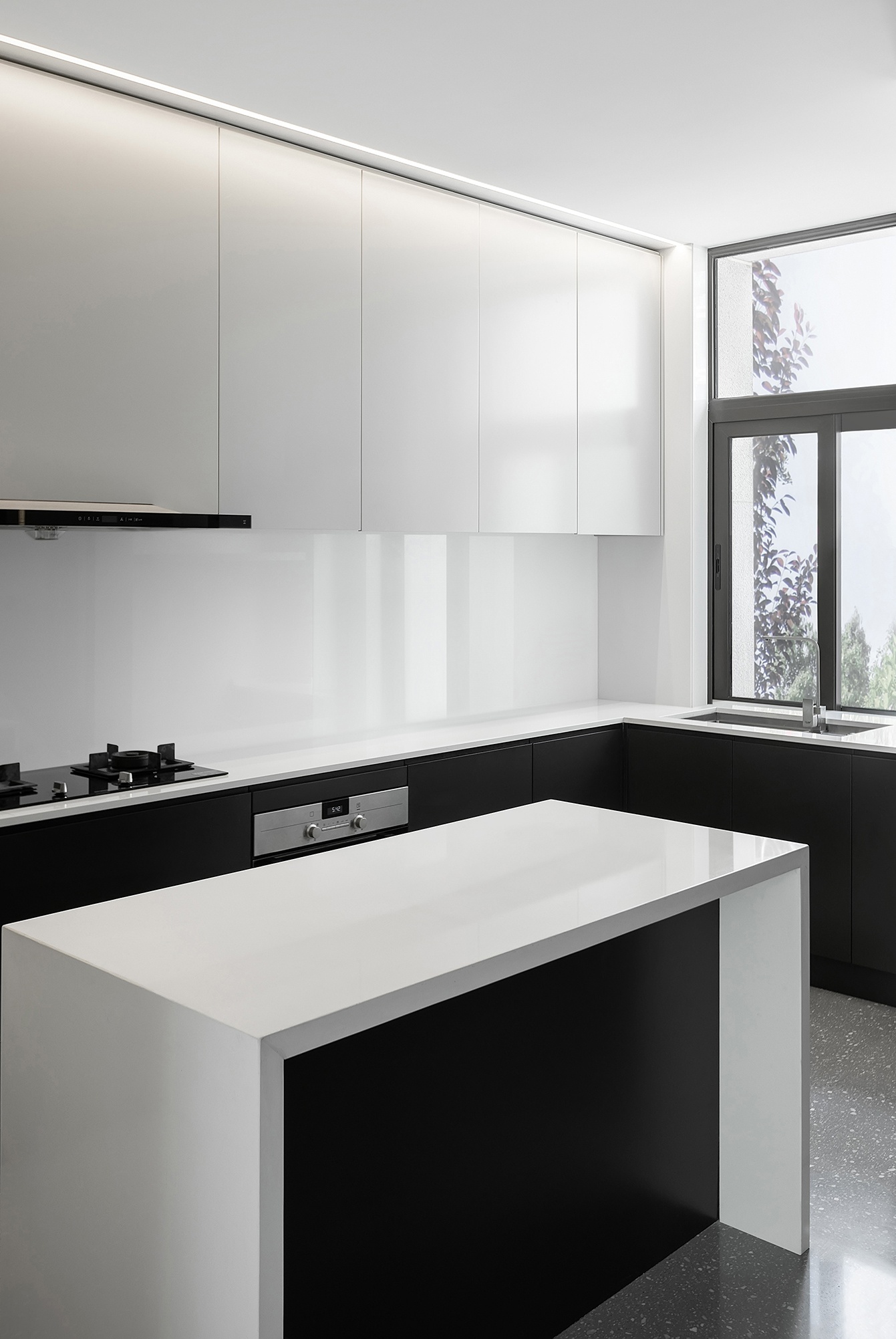 美是基礎的,在又美又酷的同時還可以極具實用性那堪稱完美。一整面黑色的柜門像整個空間的橋梁,深沉低調(diào)又極具張力的存在感,又有強烈的視覺聚焦點,整面的柜門打開龐若巨大的寶藏,里面可以收納各種日常用品以及咖啡機、榨汁機,完完全全滿足了收納的需求性。