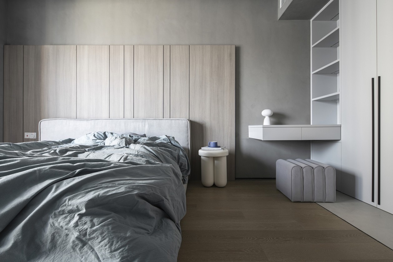 次臥與整體空間色調(diào)保持一致,同樣以簡潔為主,柔軟的白色床品搭上整體的水泥色色調(diào),給人一種干凈舒服的感受,整面衣柜也滿足了日常衣物的收納。