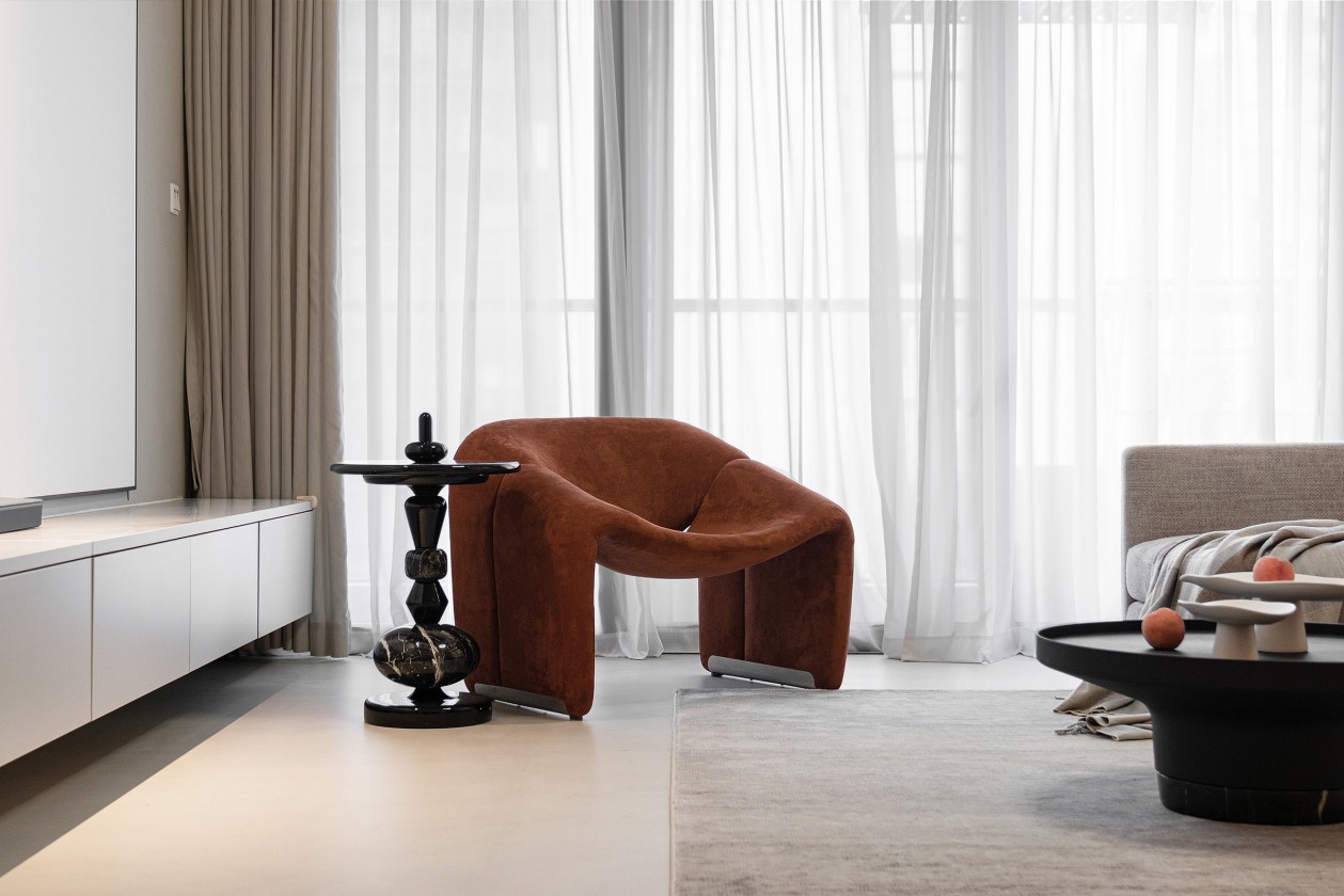 業(yè)主認為家是純粹之地,最重要功能性就是能夠擁有放松身心的休息空間。在家具選擇上摒棄不必要的形式主義,L型豆腐塊沙發(fā)+舒適座椅,軟裝設(shè)計回歸實用性。同樣利用圓弧來弱化棱角,美化裝飾,張弛有度,不顯山不露水便一舉兩得。