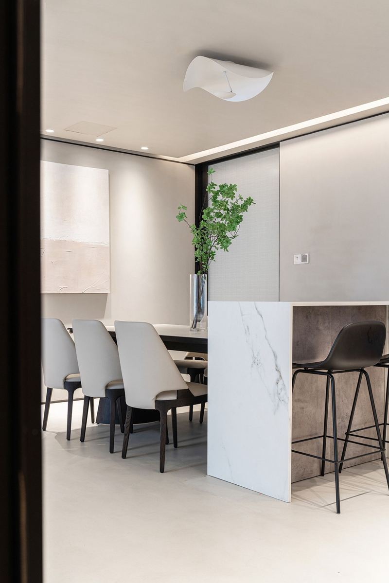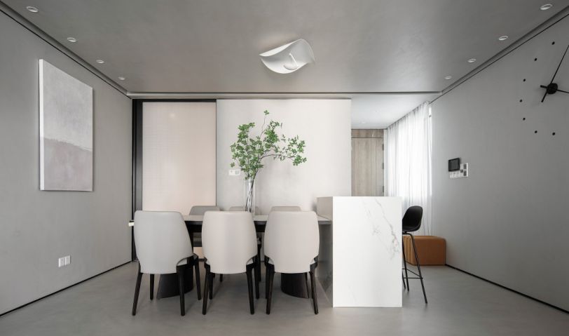 統(tǒng)一色彩材質(zhì)使得功能區(qū)被自然劃出,餐廳以素色為背景,明亮色系在視覺上放大整體空間,一小束綠植點亮生活的盎然,自然又不刻意的原始質(zhì)感貫穿始終。