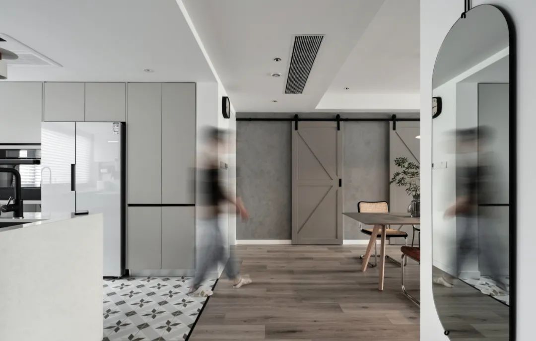 空間布局上去中心化,餐廳、中島等一個(gè)個(gè)小中心取代客廳為主中心的傳統(tǒng)布局方式。餐廳同樣可以作為休閑、會客、辦公的區(qū)域。餐桌旁的邊柜擺放著主人收藏的各種器具、手辦。閑暇時(shí),泡一杯茶,感受生活的美好。