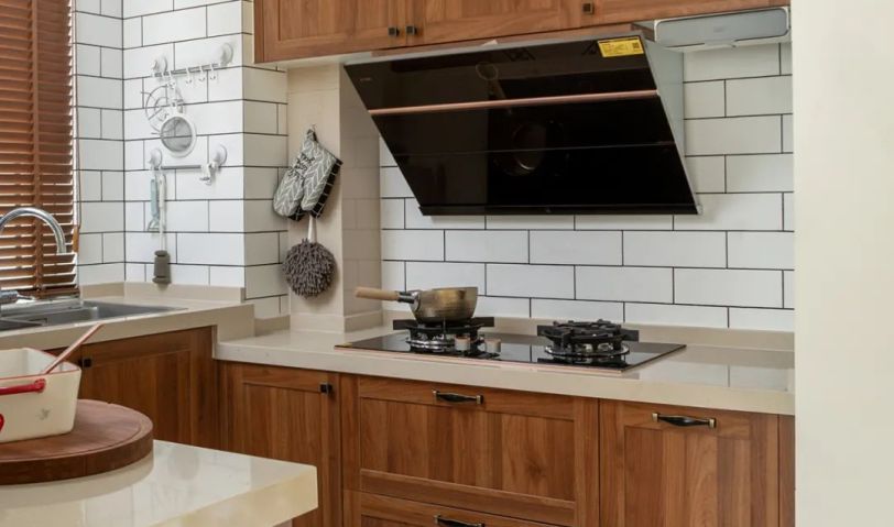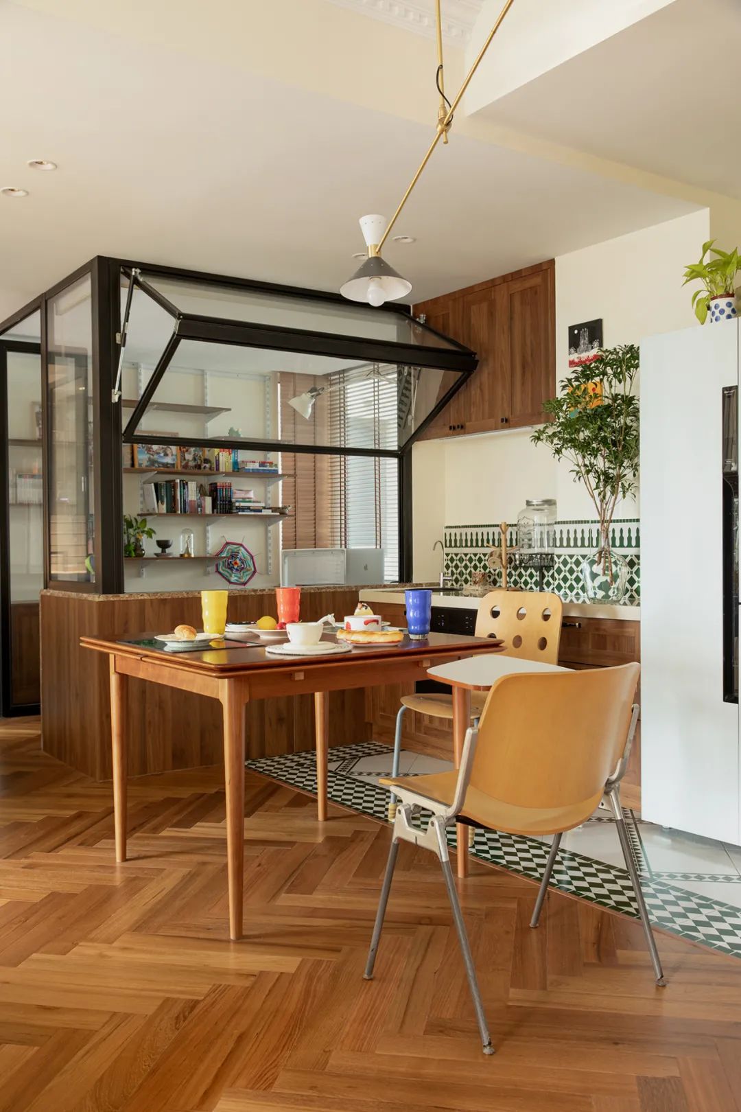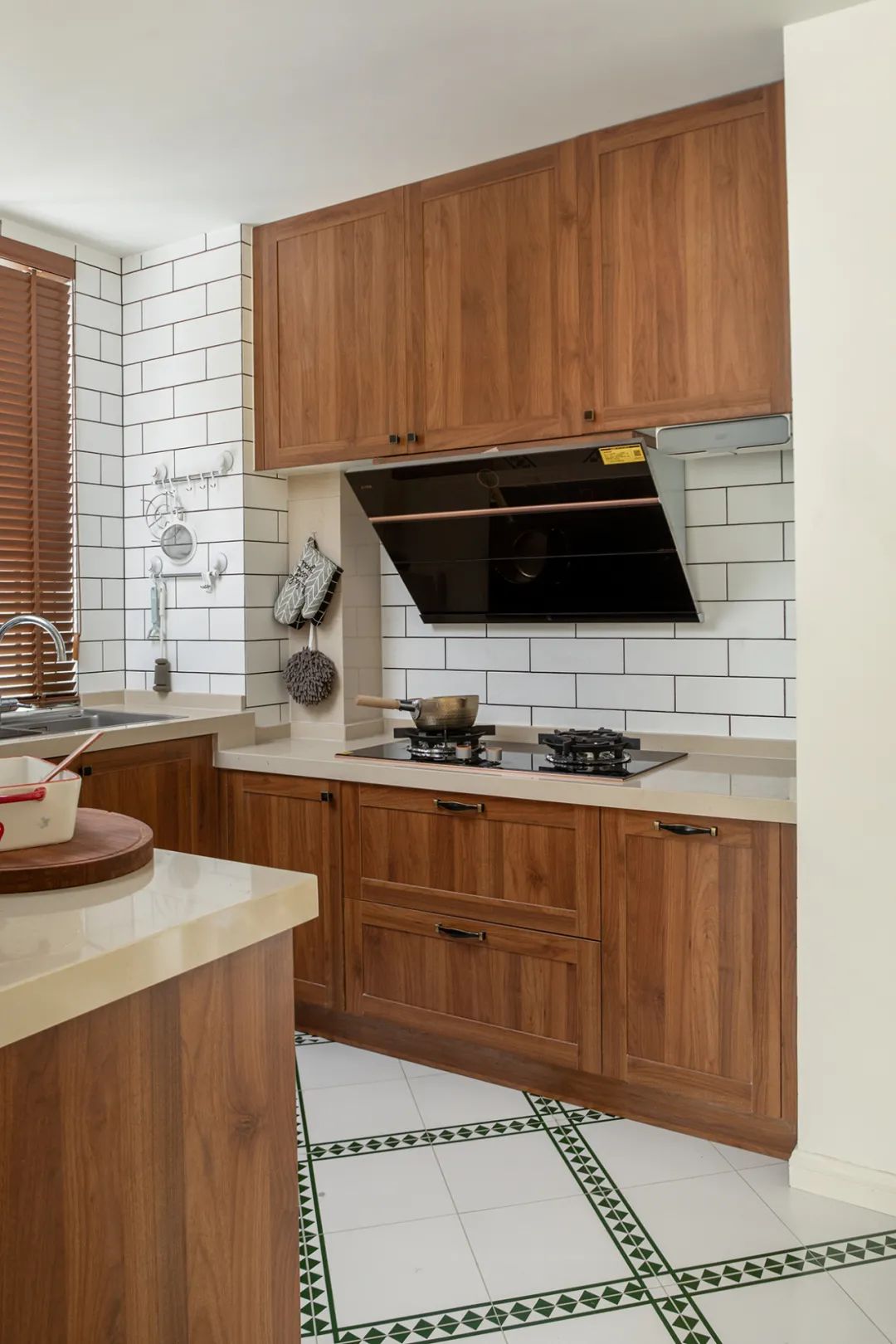 西廚地面和墻面的復(fù)古小磚,靈感來自于巴塞羅那老式建筑,復(fù)古綠+幾何花紋,對(duì)稱清新,小的細(xì)節(jié)總會(huì)給人驚喜。
