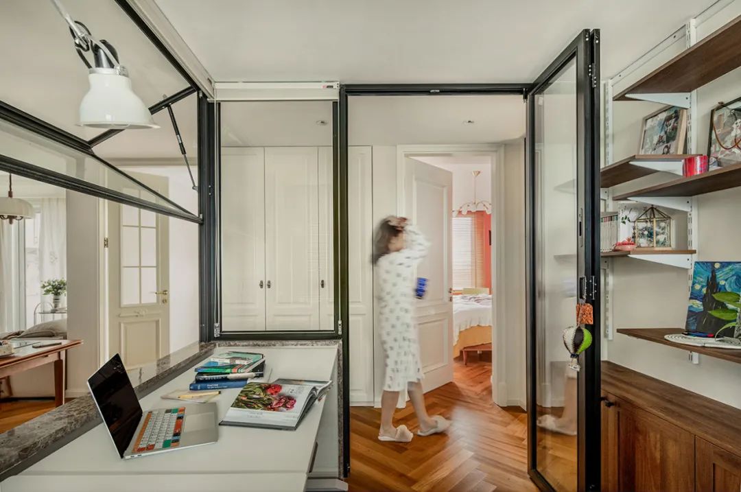 書房是屋主高頻使用空間,溝通需求時(shí),屋主表示:“我不喜歡封閉的書房,感覺像在關(guān)禁閉。我喜歡透的,但需要隔音?!?