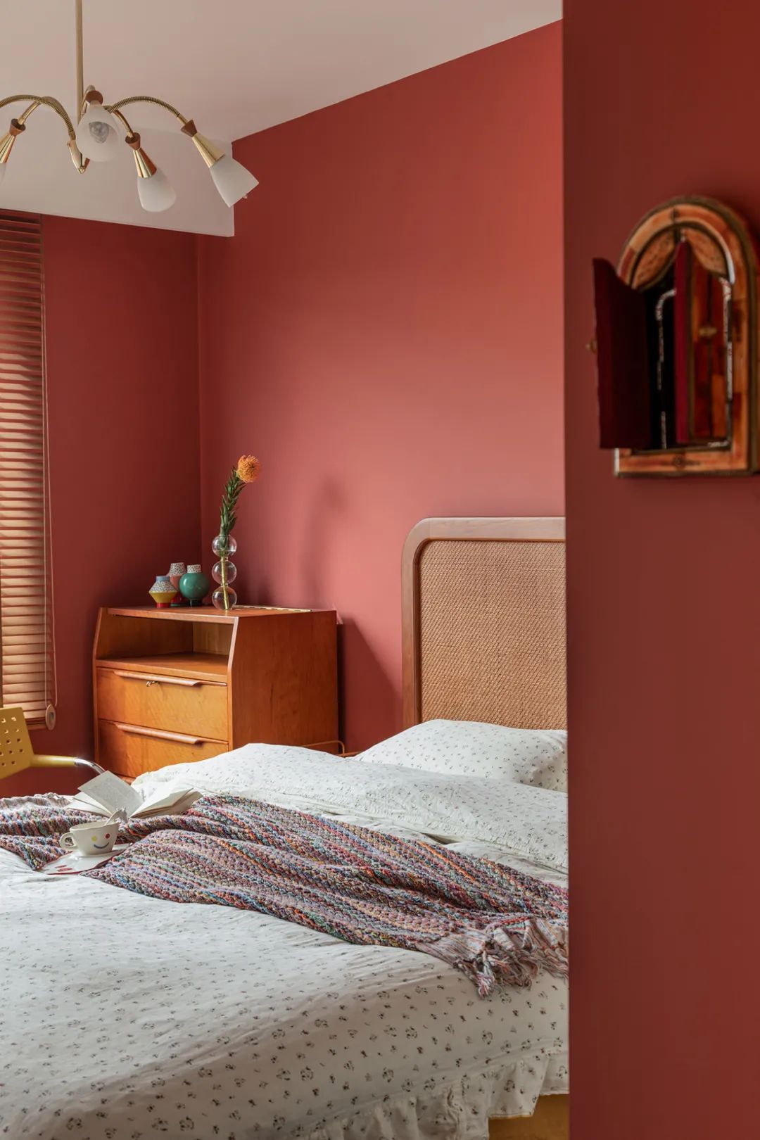 主臥空間朱砂紅為主色調(diào),選用了很有歲月感的編織床頭和柚木床,空間優(yōu)雅、知性有年代感,同時(shí)多了一份自然意趣。