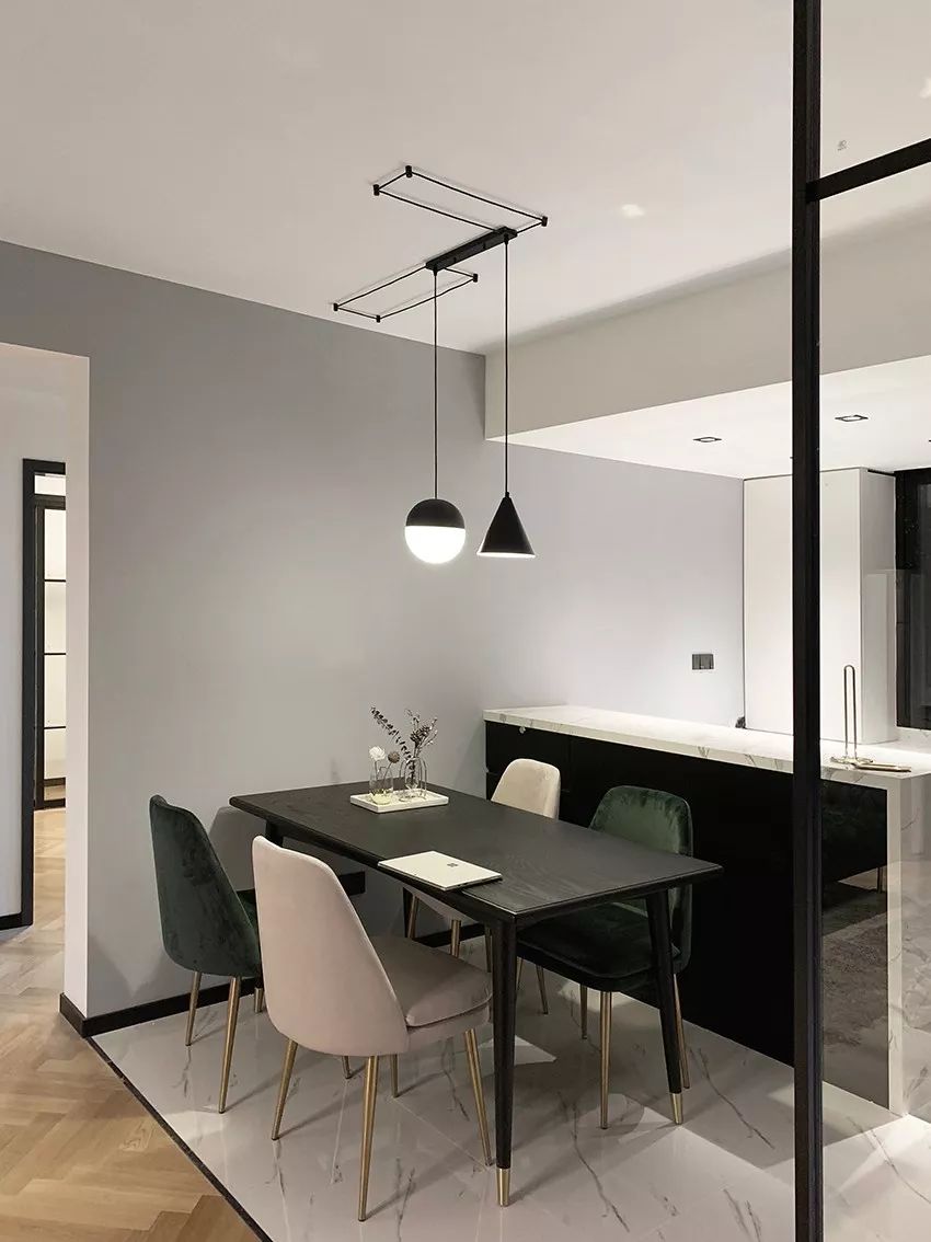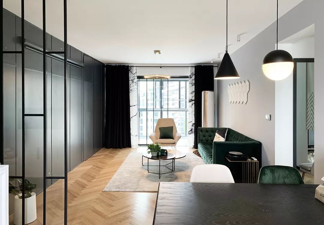 客廳硬裝以黑白灰為基調(diào),搭配墨綠色沙發(fā)和原木人字拼地板,顯得空間簡約現(xiàn)代又略帶復(fù)古情調(diào)。