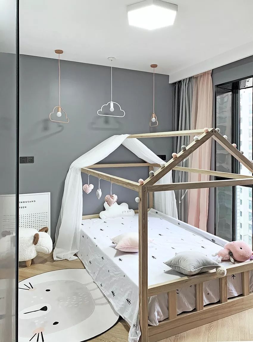 兒童房延續(xù)了整體的硬裝基調(diào),通過軟裝色彩和童趣元素的搭配,來營造溫暖的氛圍。