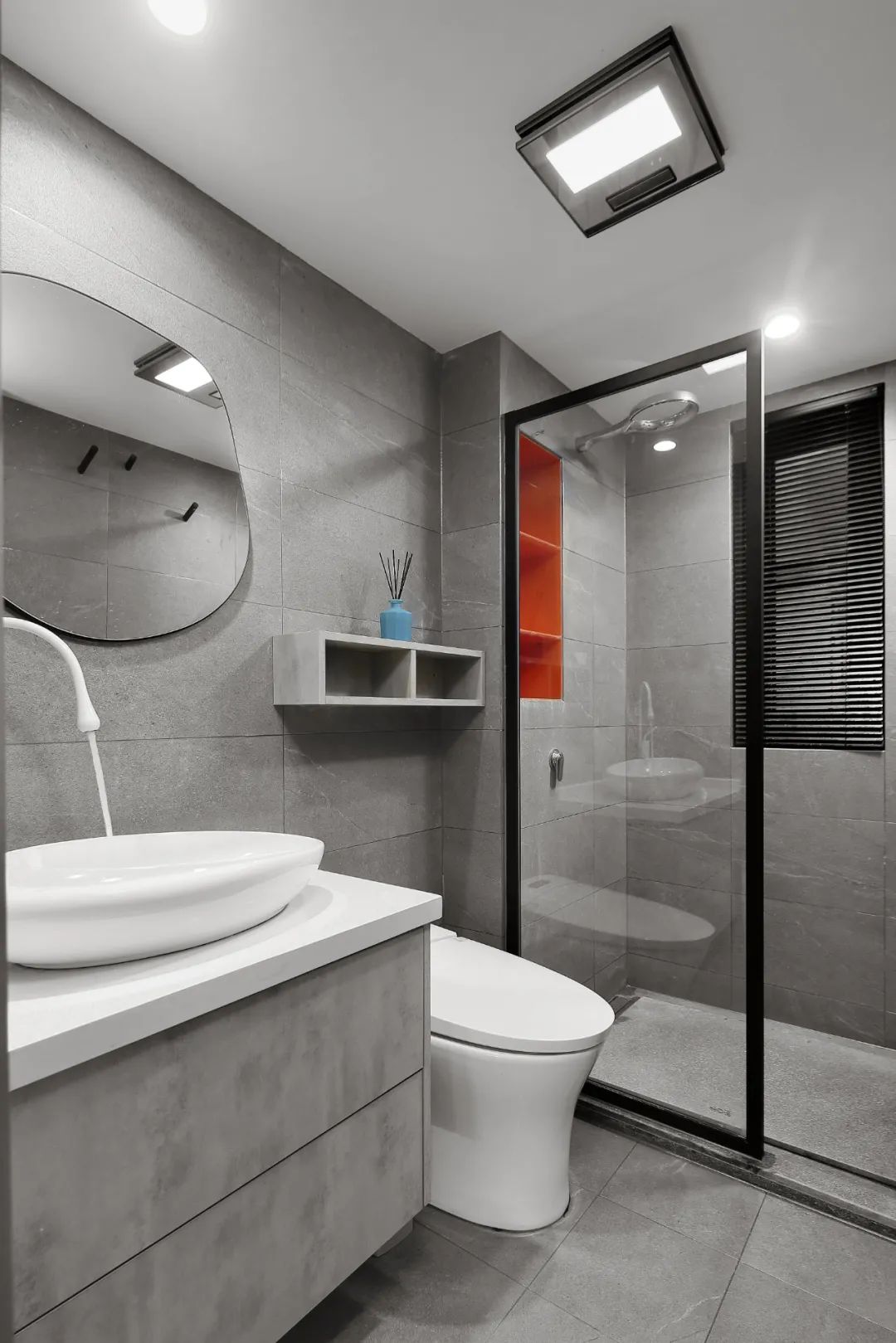 衛(wèi)生間,每一件單品都是精挑細選。墻地磚用了統(tǒng)一的灰色,同樣做了橘色點綴,綜合空間中的色感。