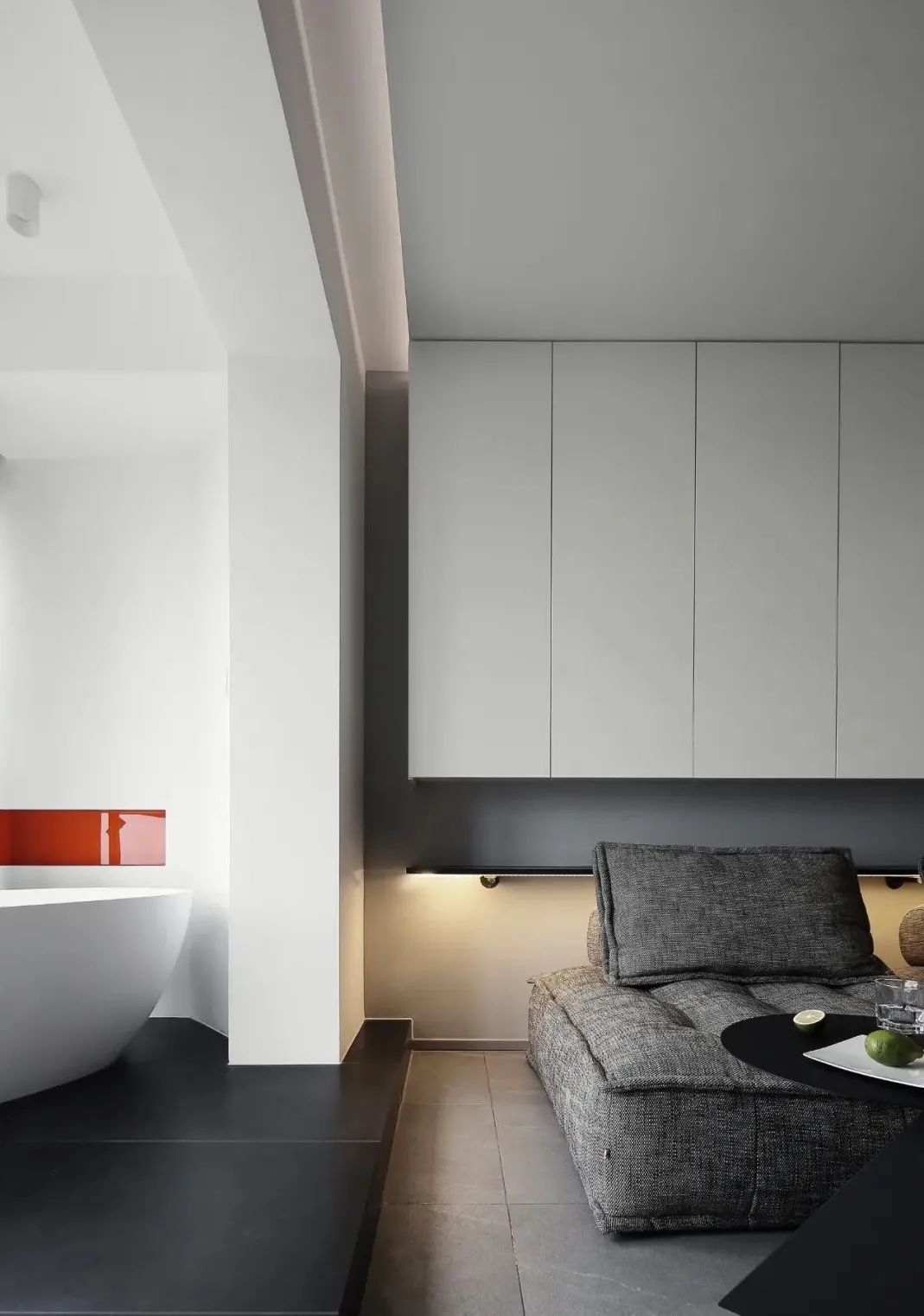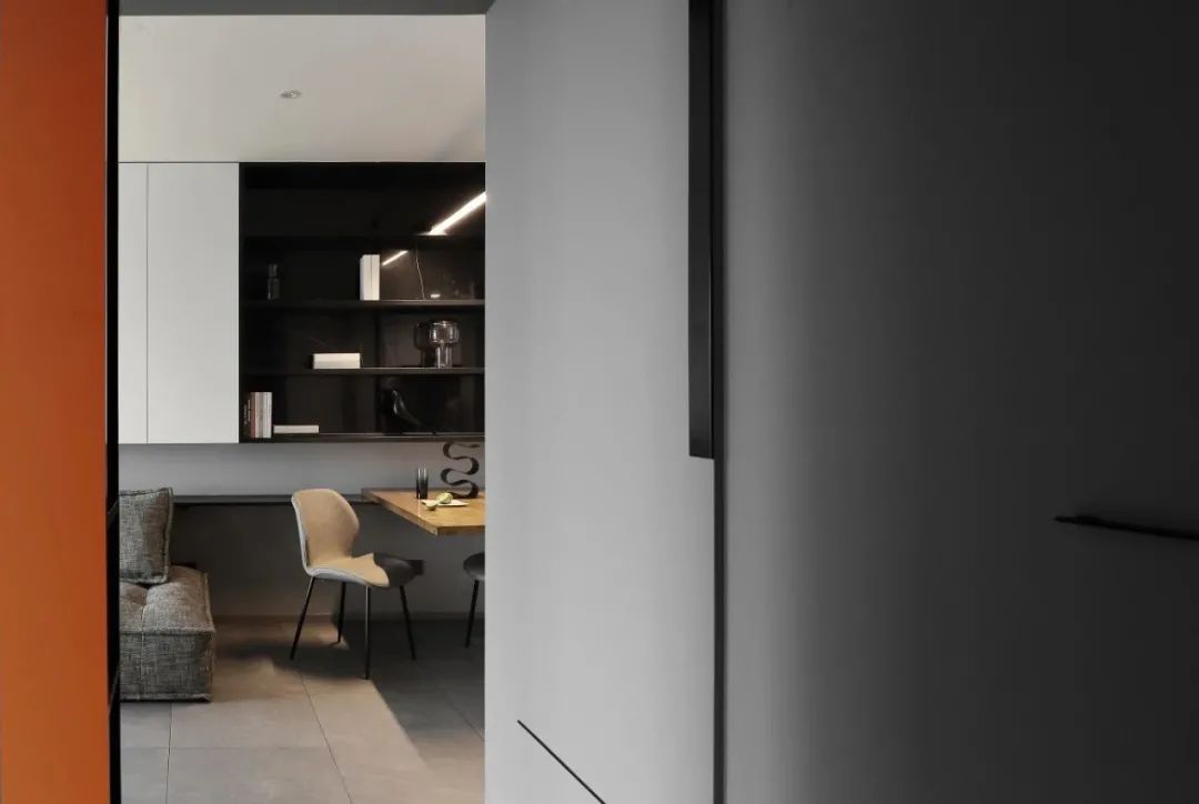 主臥,以大面積的灰色塊為基調(diào),搭配黑色家具,增加空間的厚重感,窗簾局部加入橘色點綴,打破黑白灰的清冷。