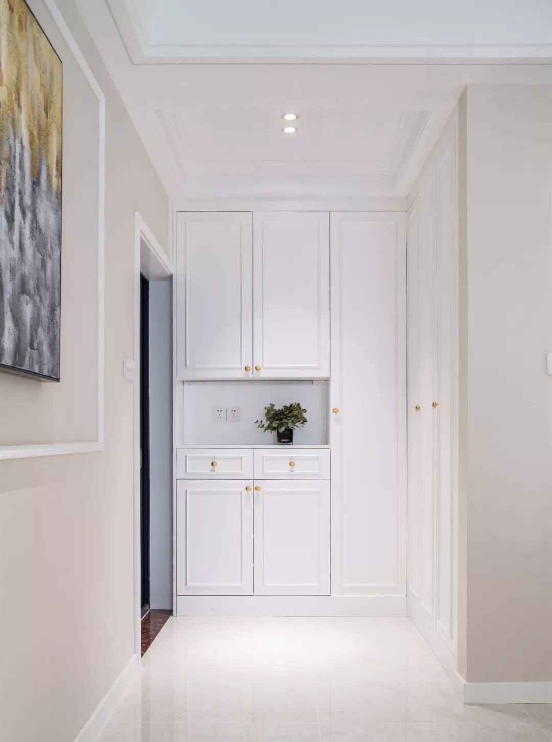玄關的功能性十分強大,不僅收納力十足,且美觀度也是非常強的。壁龕式的設計,既方便進出門防止鑰匙等小物品,也方便展示。