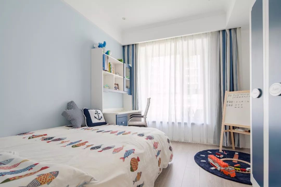 兒童房利用藍色與白色拼接的模式裝點,靠墻的床,為小朋友留足了活動空間。