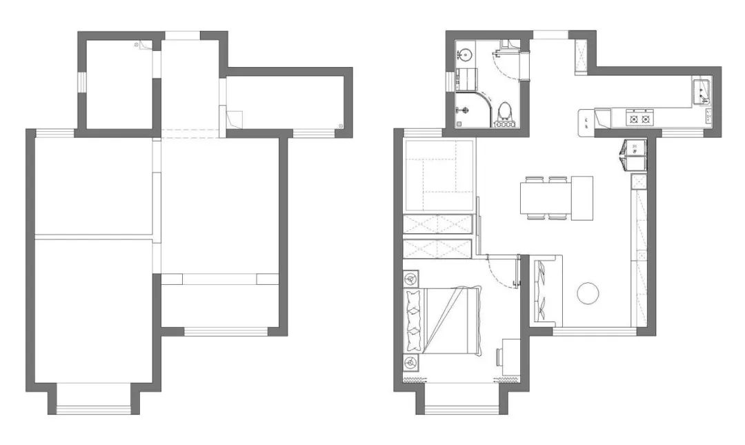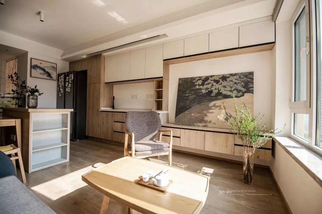 客廳定制電視柜與餐廳的邊柜、高柜一體定制,上層使用白色,底下使用原木色,豐富層次的同時(shí)也顯得不會(huì)過(guò)于擁擠壓抑,功能上的需求也得到了滿(mǎn)足。