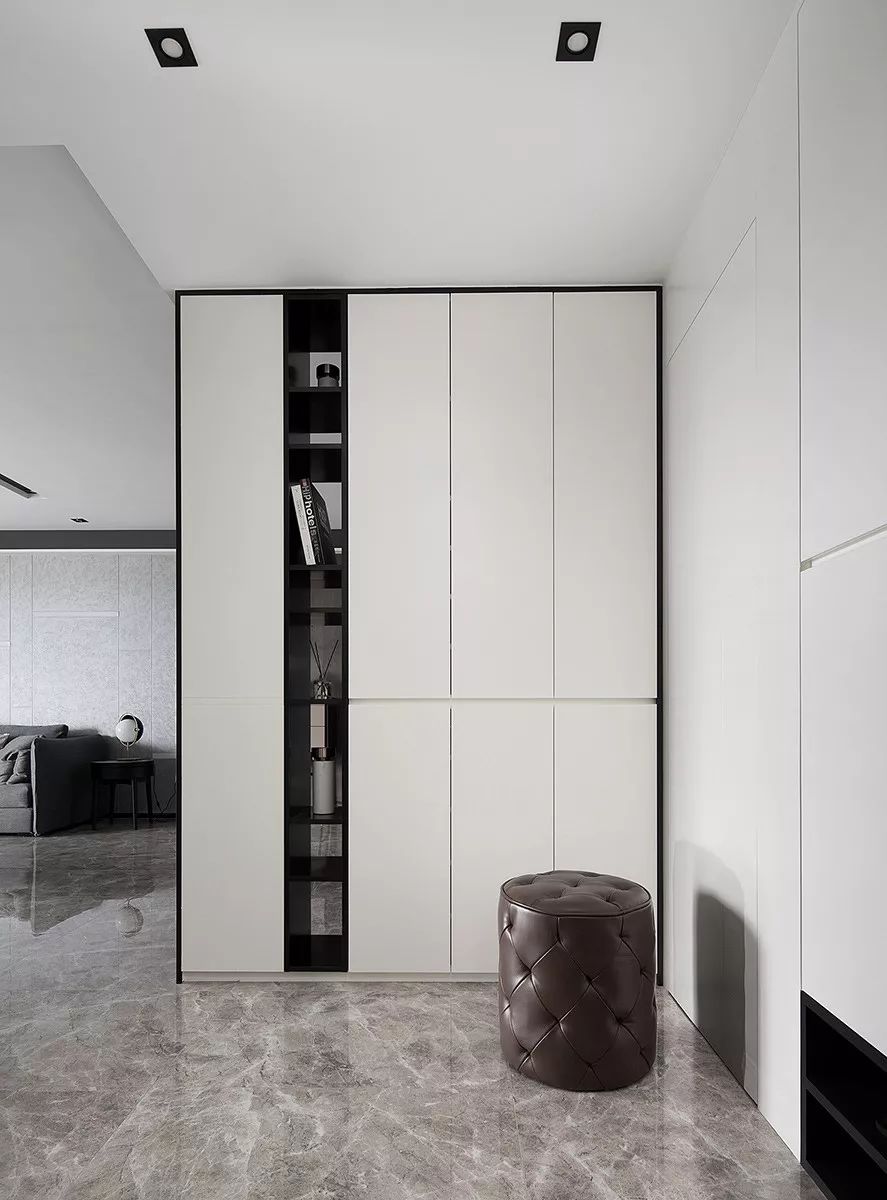 黑色亞光拉絲不銹鋼的框架+木質(zhì)的柜面組成的雙開(kāi)柜,既是玄關(guān)柜又是餐邊柜,還充當(dāng)了入戶屏風(fēng)的角色,解決了入戶即可見(jiàn)臥室門的問(wèn)題。右側(cè)以隱形門做了儲(chǔ)物間設(shè)計(jì),玄關(guān)更加整潔美觀。