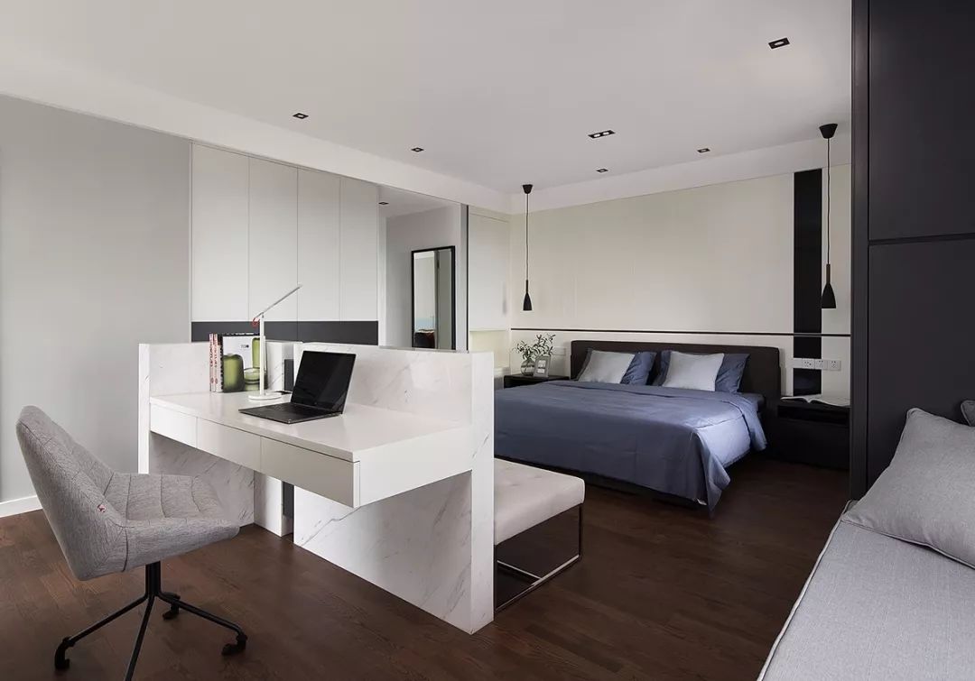 主臥以套間形式打造,沿用了黑白灰的主色調(diào),似一位謙謙學(xué)者,溫和,平易近人;石材墻體與木質(zhì)書桌,搭建起業(yè)主辦公的空間。