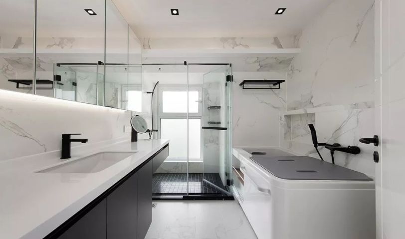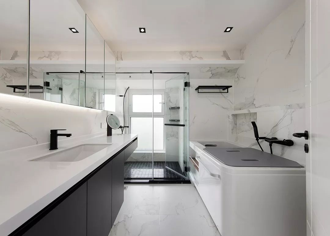 黑色的浴室柜搭配紋理曼妙的大理石紋,打造簡(jiǎn)潔實(shí)用的主衛(wèi)空間;設(shè)計(jì)師尺子在活動(dòng)浴缸右上方做了壁龕,方便放置洗浴用品。