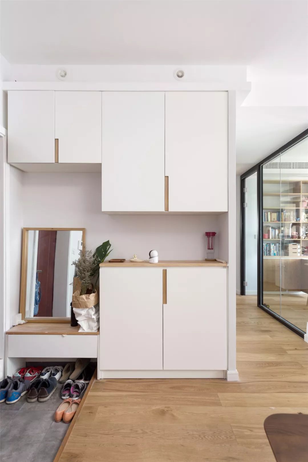 玄關(guān)處地面鋪貼灰色磚,不僅耐臟也好打理,鞋柜的側(cè)邊做了一面墻,剛好把鞋柜嵌入進(jìn)去。