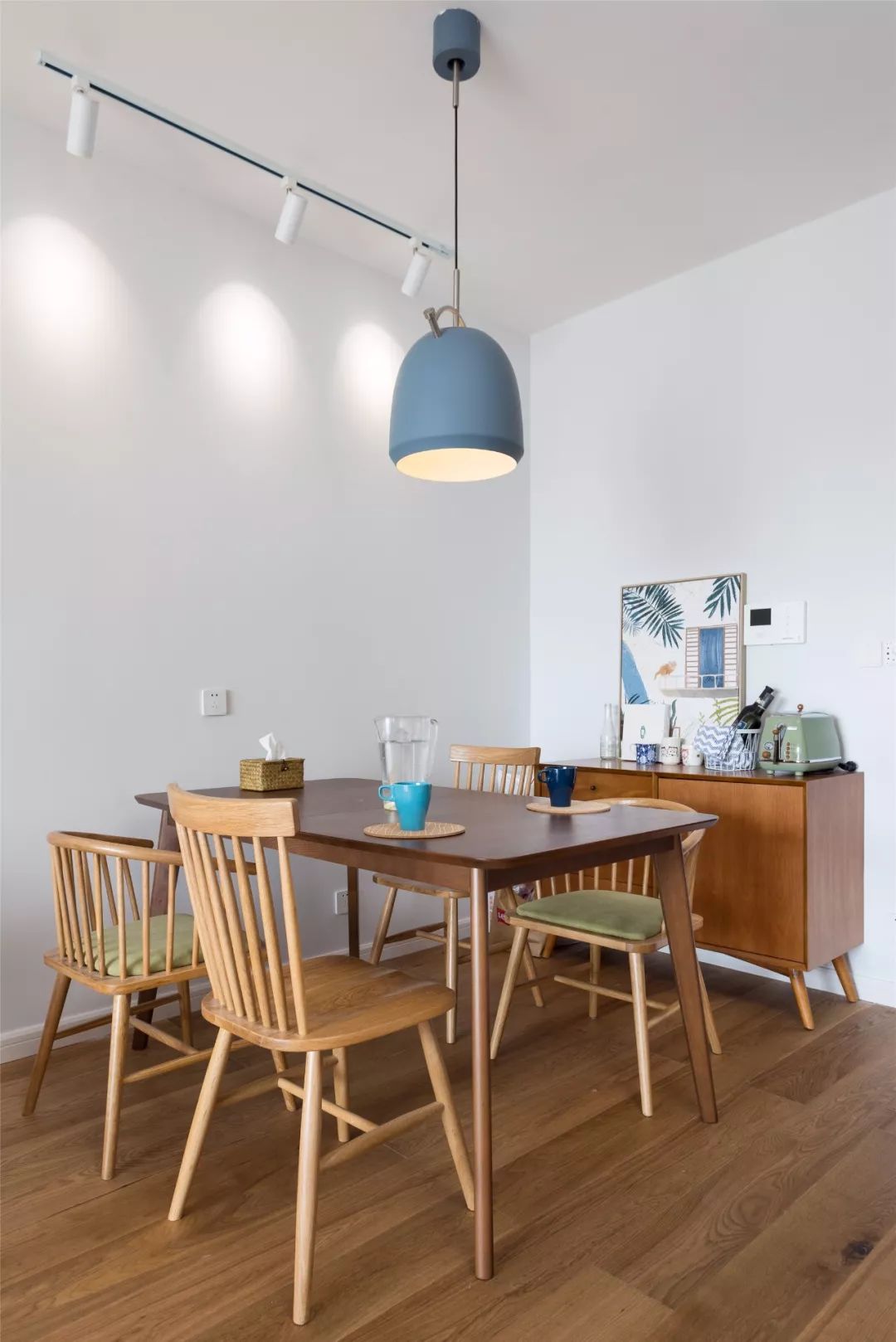 餐廳選用黑胡桃木餐桌+溫莎椅,自然舒適,天花采用一盞藍(lán)色的單頭吊燈+一排導(dǎo)軌射燈來(lái)照明,給餐廳帶來(lái)了些許活力。
