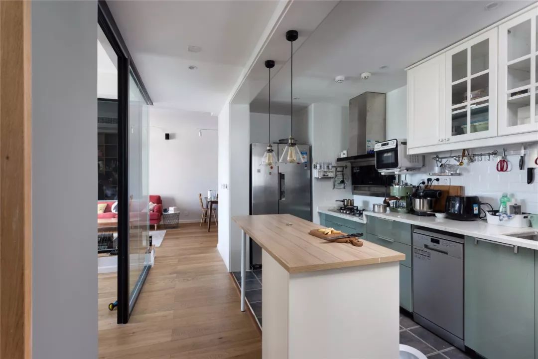 做成開放式的廚房,利用過道的區(qū)域,在中間做了一個(gè)吧臺(tái),同時(shí)也可以作為備餐區(qū)跟餐廳區(qū),因?yàn)橛兴?,生活都變得豐富起來(lái)。