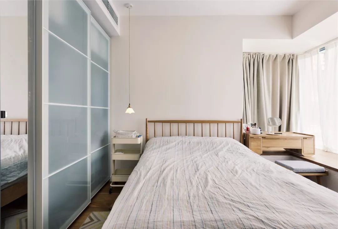 定制的衣柜,用玻璃推拉門+鏡柜門取代傳統(tǒng)的木質(zhì)柜門,在視覺上可以讓空間擴(kuò)大N倍,另外床頭的一邊是梳妝臺(tái),方便女主平時(shí)的梳妝打扮,另一邊則是宜家小推車,絕對(duì)是收納物品的“好幫手”。