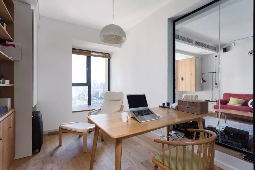 打掉客廳與書房的一小面墻體,取而代之的是用玻璃來(lái)作為兩個(gè)空間的隔斷,空間瞬間就變大變亮了起來(lái)。