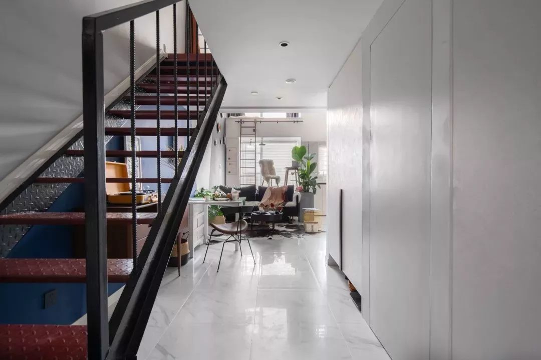 為節(jié)省預(yù)算,入戶門沒(méi)有更換,貼了符合空間氣質(zhì)的毛氈,并裝飾了“77‘s home”的字樣,營(yíng)造可愛(ài)的小小儀式感。進(jìn)門左手邊的衛(wèi)生間門做了隱形處理;右手邊的樓梯,做了扶手和踏步的分色。