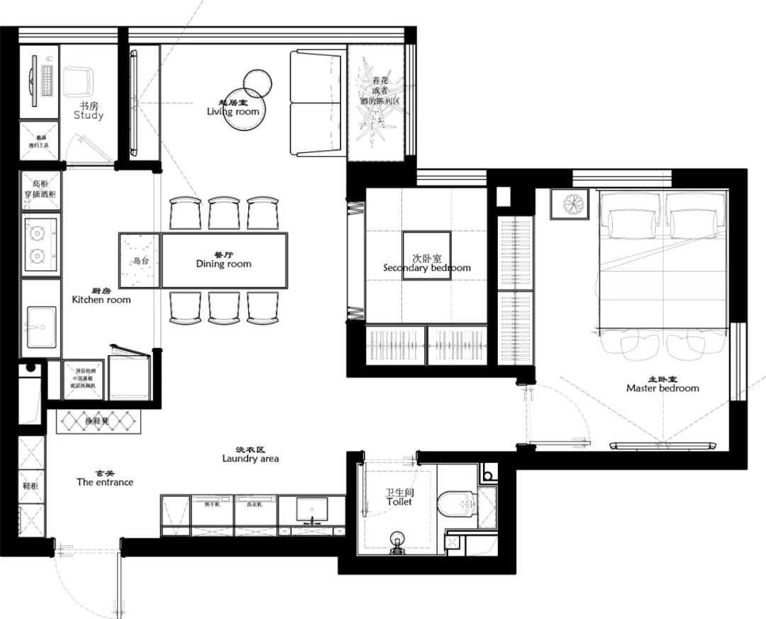 4. 原餐廳變成衛(wèi)生間干區(qū),增加洗衣機(jī)烘干機(jī),解決沒(méi)有陽(yáng)臺(tái)的問(wèn)題。