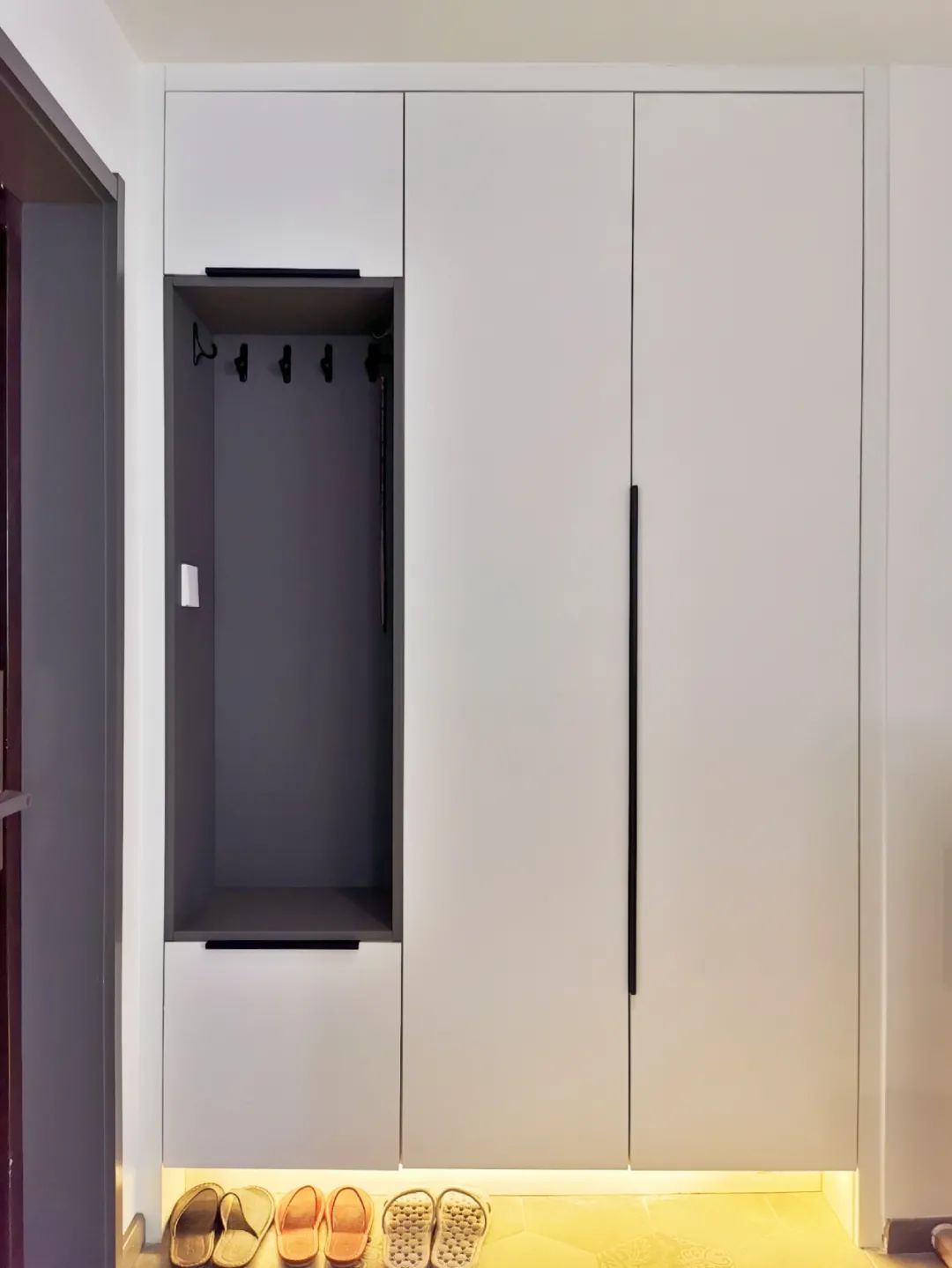 玄關(guān)側(cè)面是滿墻的鞋柜,鞋柜下面懸空150mm打上燈帶,放置拖鞋。