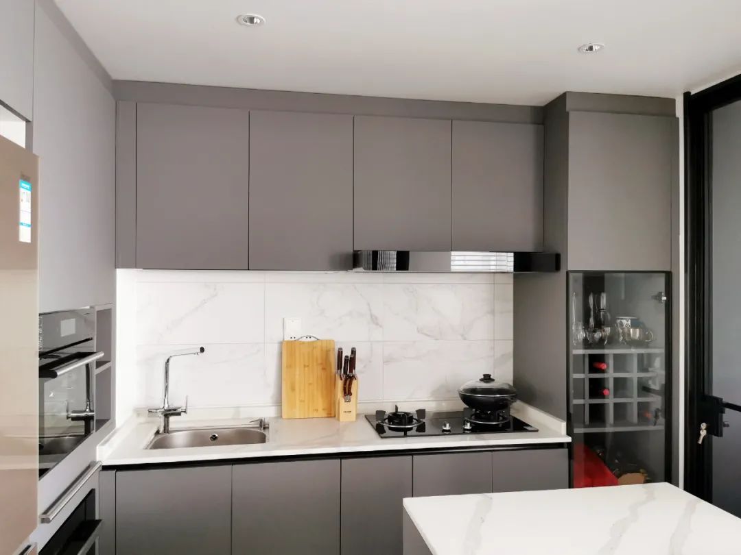 廚房原本是超長(zhǎng)一字型,改成開放式設(shè)計(jì),操作臺(tái)放置洗菜盆和灶臺(tái),中間用來(lái)切菜,后面配了一個(gè)中島,一個(gè)轉(zhuǎn)身實(shí)現(xiàn)所有操作。