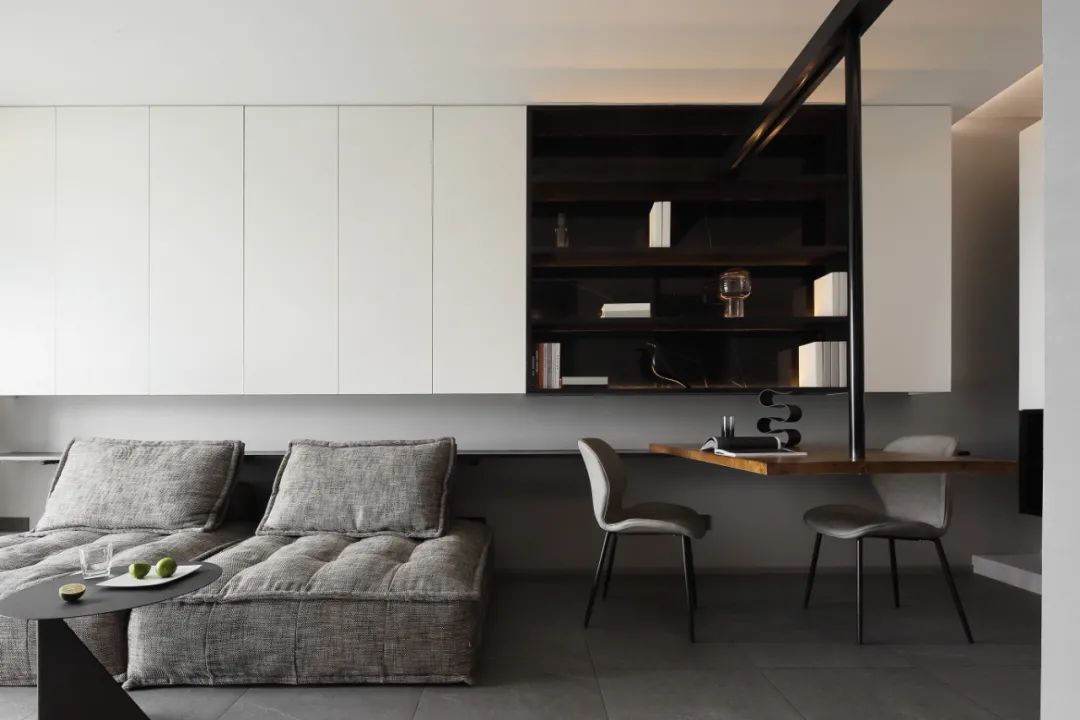 3. 餐桌和電視柜都做了懸浮處理,融入空間結(jié)構(gòu)。