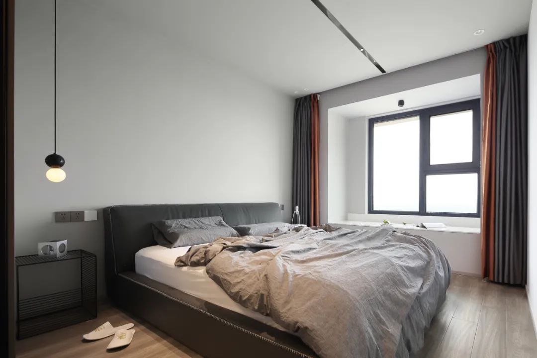 主臥,以大面積的灰色塊為基調(diào),搭配黑色家具,增加空間的厚重感,窗簾局部加入橘色點(diǎn)綴,打破黑白灰的清冷。