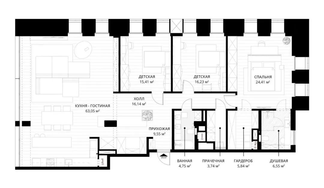 在公寓的私人部分有一個(gè)主臥室、一個(gè)更衣室和一個(gè)淋浴間、兩個(gè)兒童房、一個(gè)浴室和一個(gè)洗衣房的單一區(qū)域。
