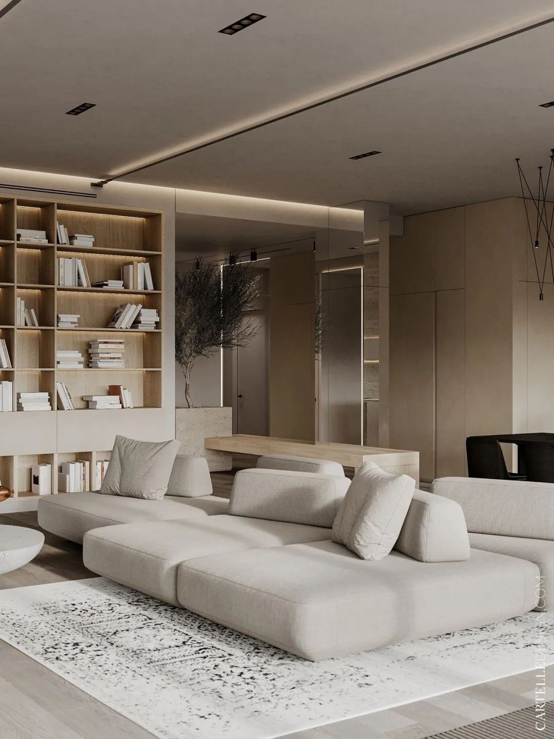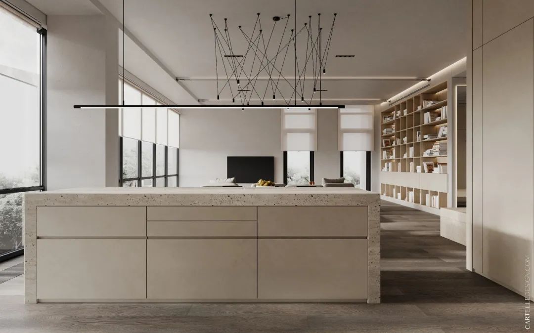 該住所的主要優(yōu)點(diǎn)是自由規(guī)劃、高挑的天花板、帶玻璃窗、所有房間以及浴室都是落地窗??蛷d一整面墻的大書架,不管你愛不愛看書,也是實(shí)用的收納方案,也可以做置物架。