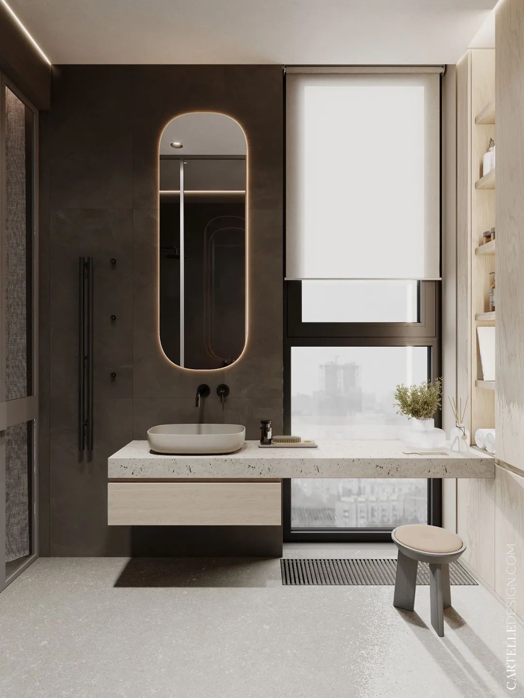 以優(yōu)化空間為主要任務(wù),設(shè)法使空間的每平方米面積都得到利用,為其提供了所有必要的功能。將公寓分為兩個(gè)區(qū)域布局,走廊、廚房和客廳的公共空間是這個(gè)項(xiàng)目最成功的解決方案。這個(gè)區(qū)域的中心是長(zhǎng)凳旁邊的一棵樹,象征著家庭。