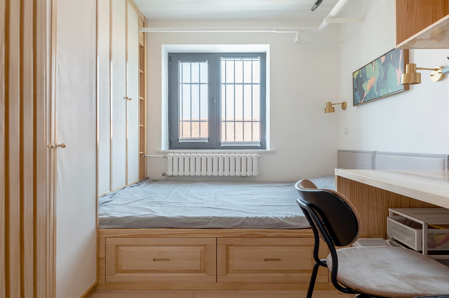 主臥定制榻榻米和儲(chǔ)物,充分的利用每一寸空間。男主人偶爾會(huì)有辦公的需求,增加了電腦桌。老房子管道比較多,直接將裸管進(jìn)行刷漆處理,能夠很好的融入空間,不突兀即可。