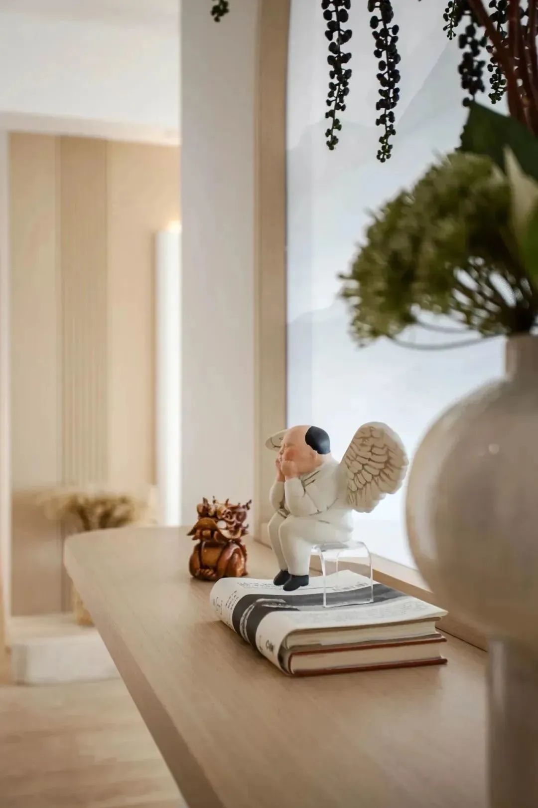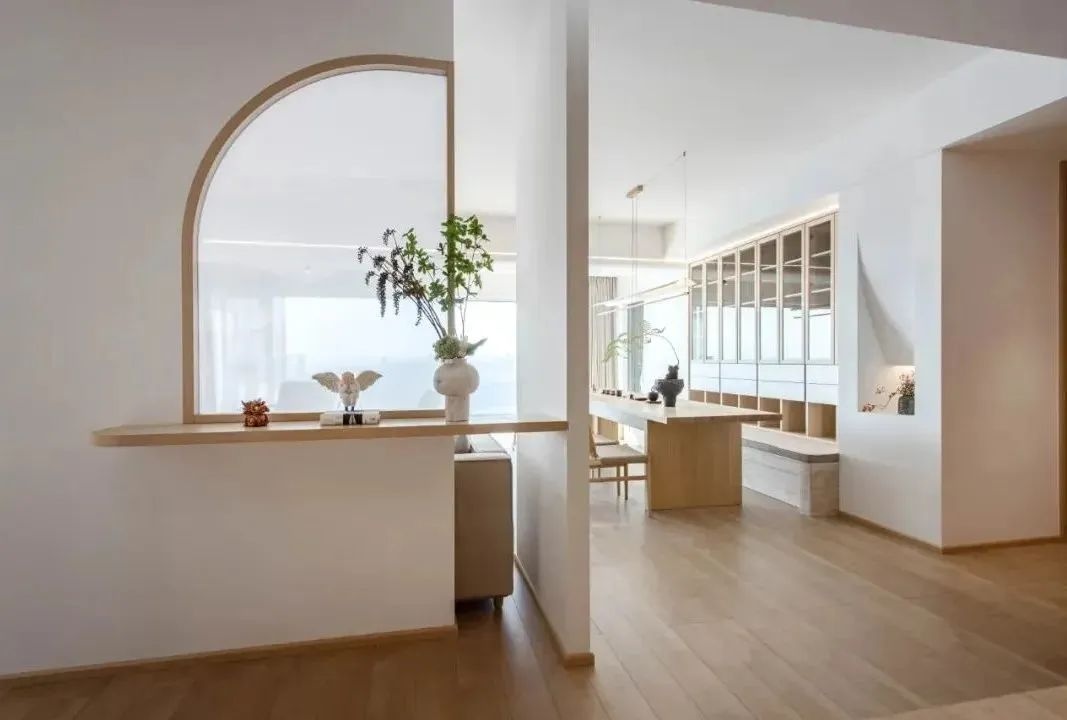 玄關(guān)用了錯(cuò)墻和框景的處理方式,隔而不斷,一步一景,家的不同角度看,它都是變化的畫卷。