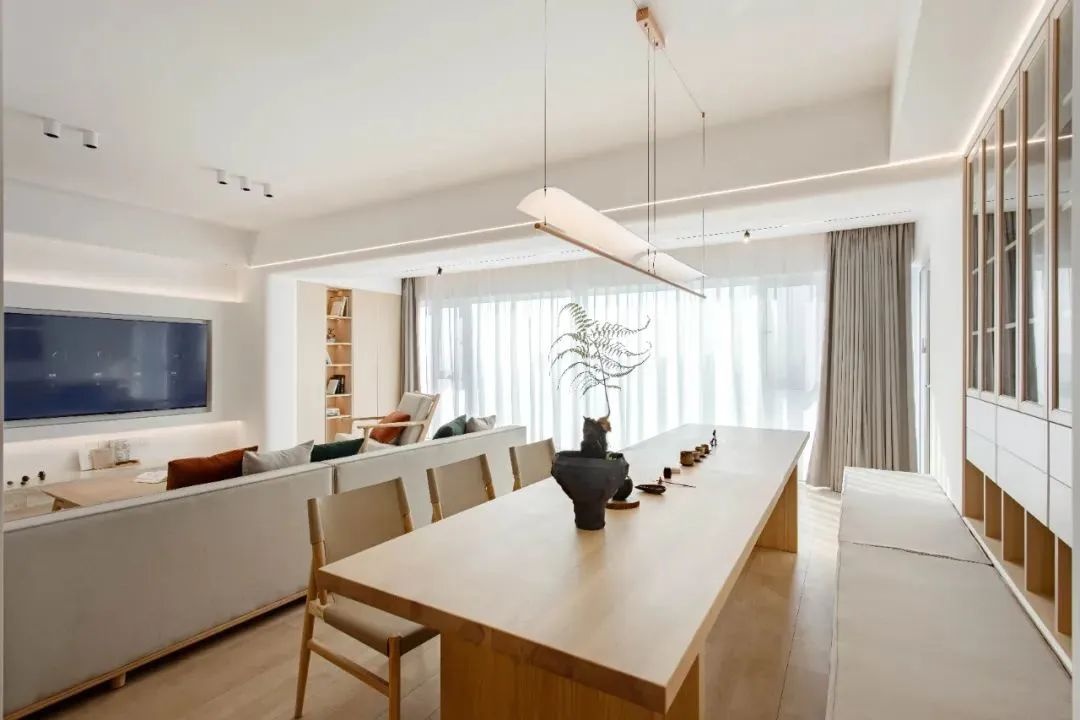餐廳是一張超級(jí)大的長(zhǎng)桌,兼顧餐桌和茶桌的功能,也是家人團(tuán)聚,交流,以及發(fā)展興趣的地方